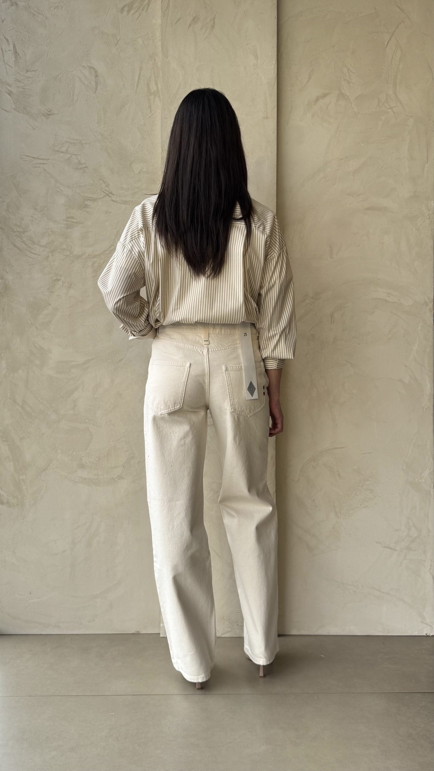 Jeans denim bull ecru, vita regolare, vestibilità morbida gamba dritta e ampia, cinque tasche, chiusura con bottoni e zip.