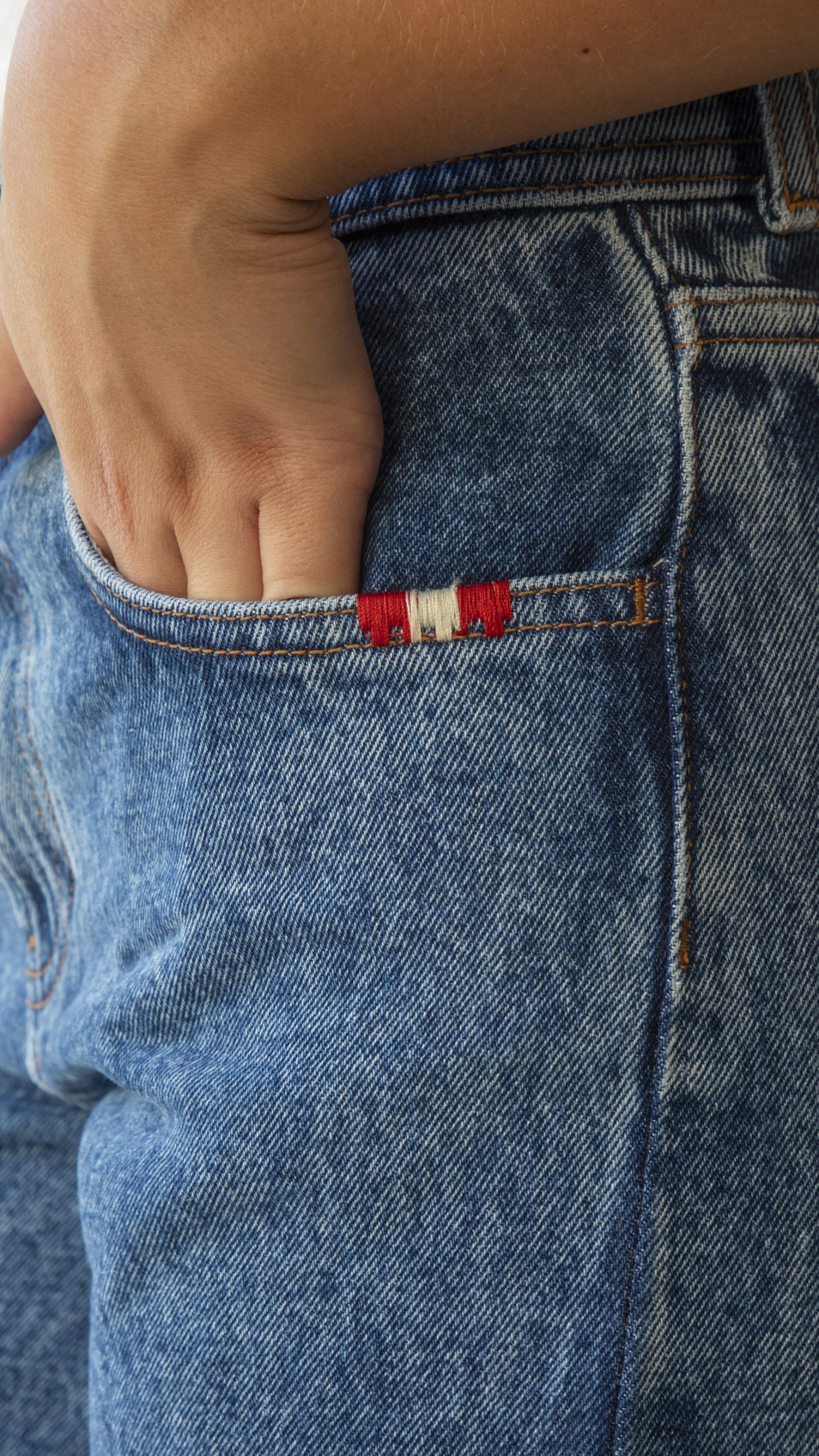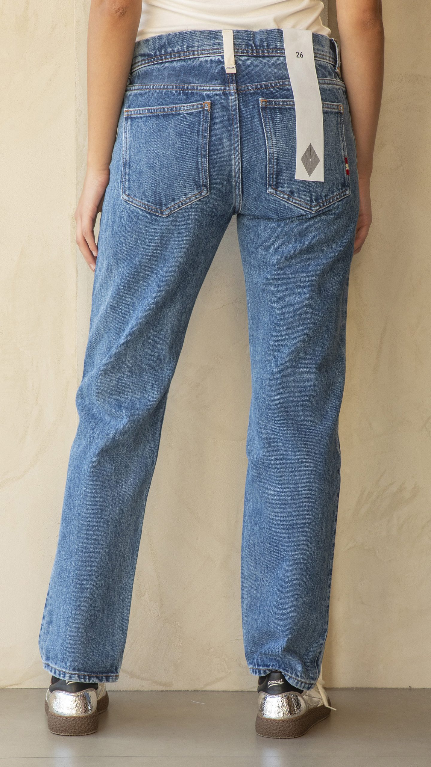 Denim effetto vissuto, modello dritto, vita regolare con passanti, design a cinque tasche, chiusura frontale con bottoni e zip, applicazione posteriore con logo