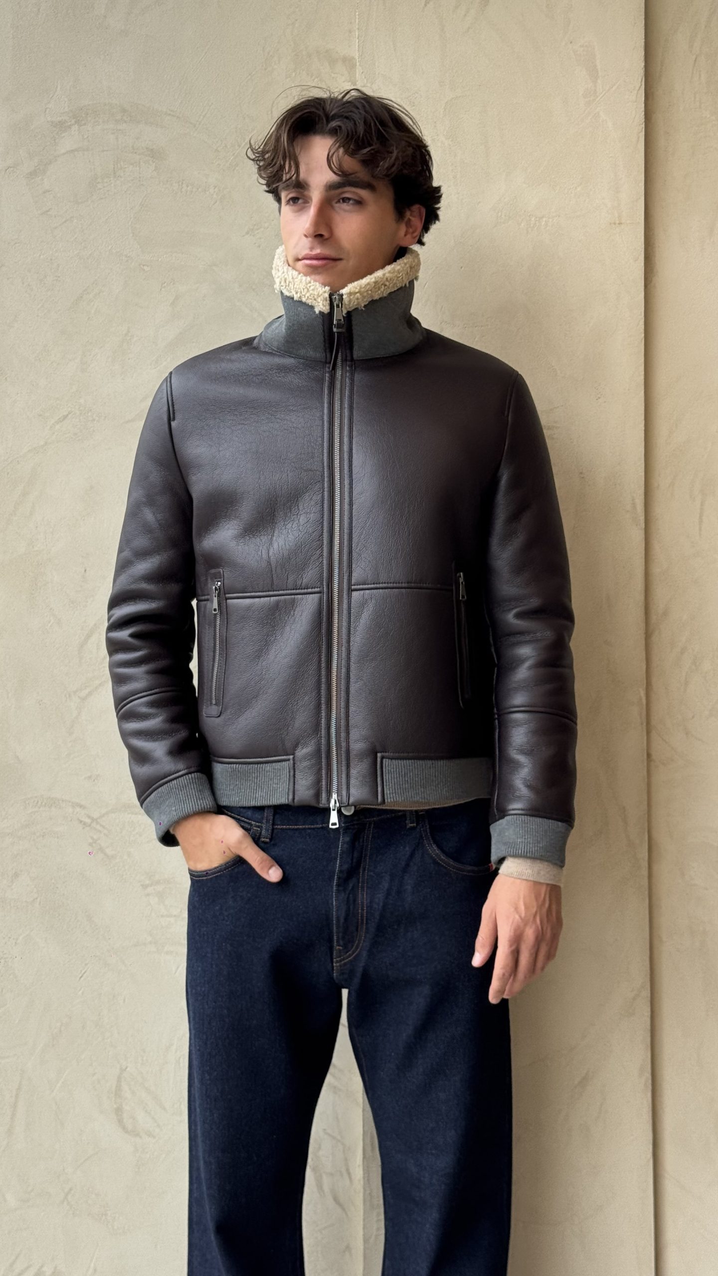 Jacket in ecomontone dal look sofisticato e contemporaneo. La finitura effetto suede all’esterno incontra un interno caldo e avvolgente in ecopelliccia beige a contrasto, visibile anche nel colletto a camicia. La chiusura frontale con zip a doppio cursore garantisce praticità e comfort.