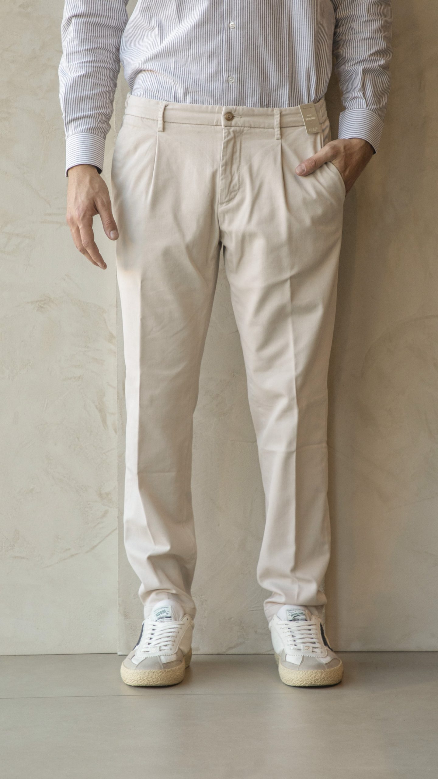l pantalone Berlino, realizzato in tricotina stretch, unisce comfort e praticità grazie alla vita elasticizzata e alla coulisse interna regolabile. Completano il design le tasche laterali e le tasche a filetto sul retro.