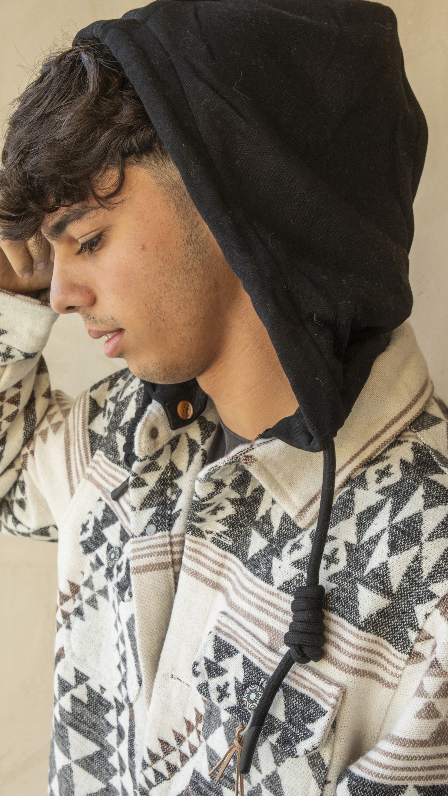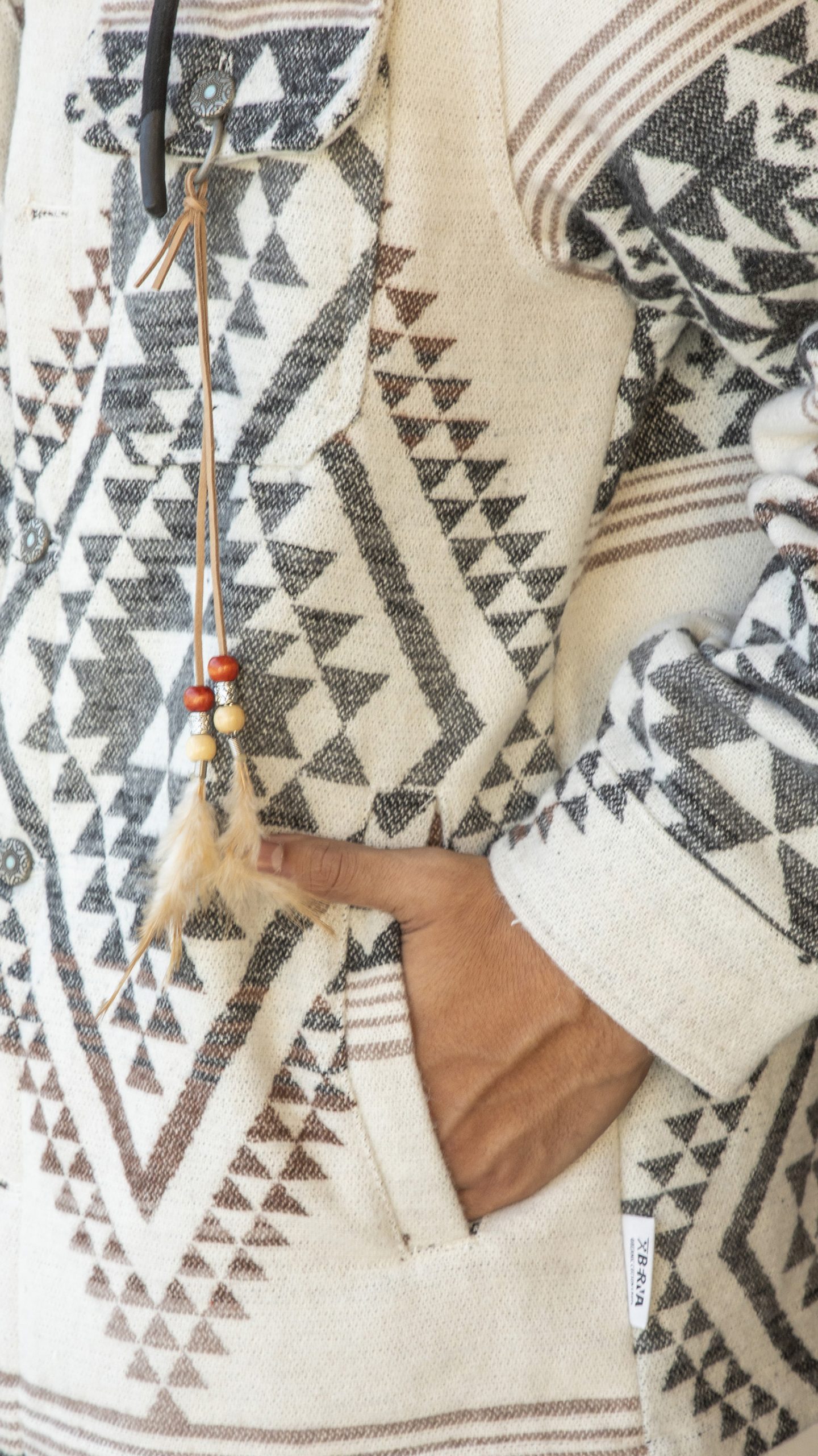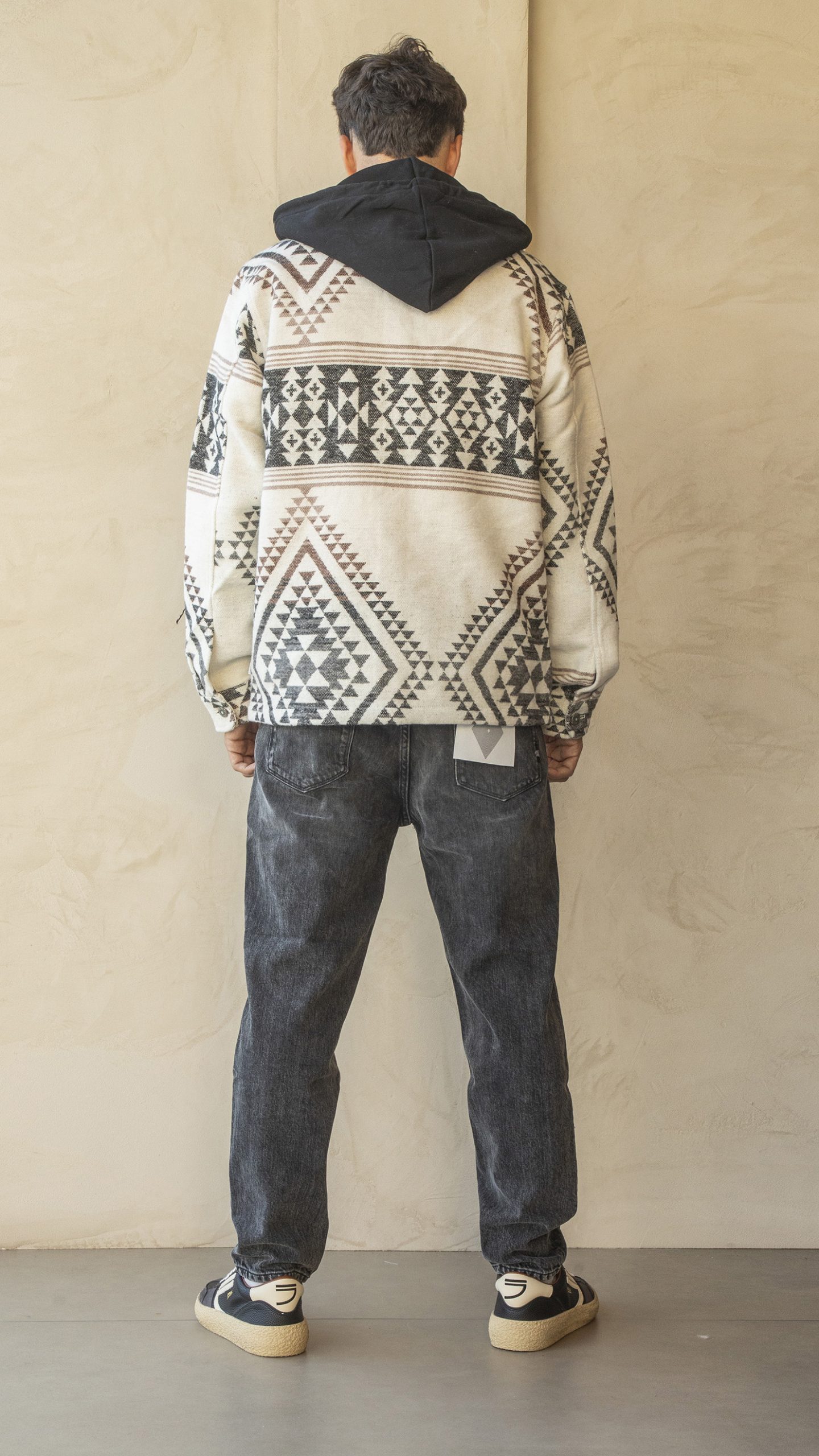 Camicione stampa azteca, vestibilità comoda, chiusura con bottoni in ferro stampati, cappuccio a contrasto removibile, tasconi frontali, logo applicato su targhetta nel fianco sinistro.