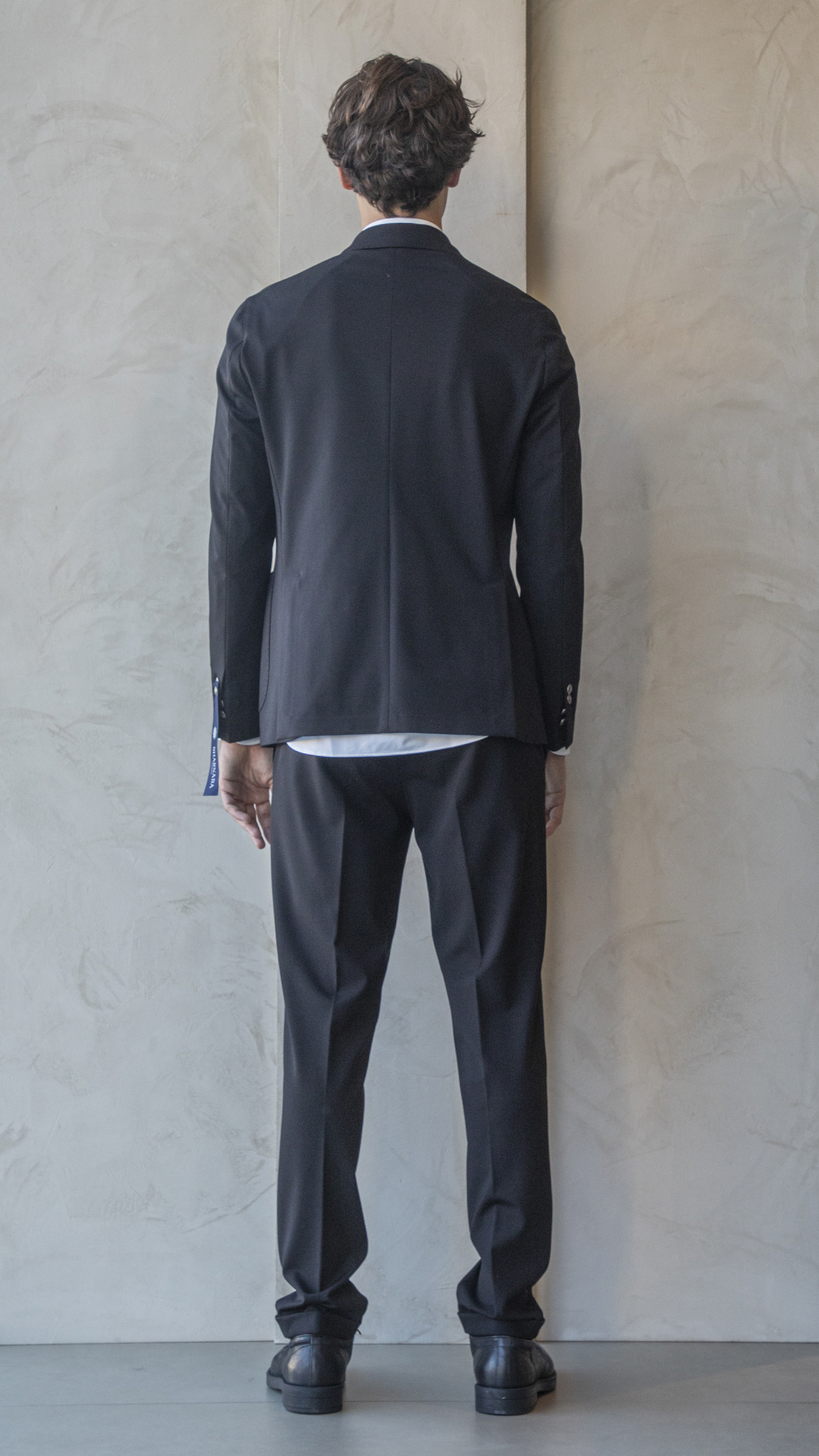 Abito due pezzi, giacca monopetto a due bottoni in ferro stampato, tasche a toppa, vestibilità regolare.