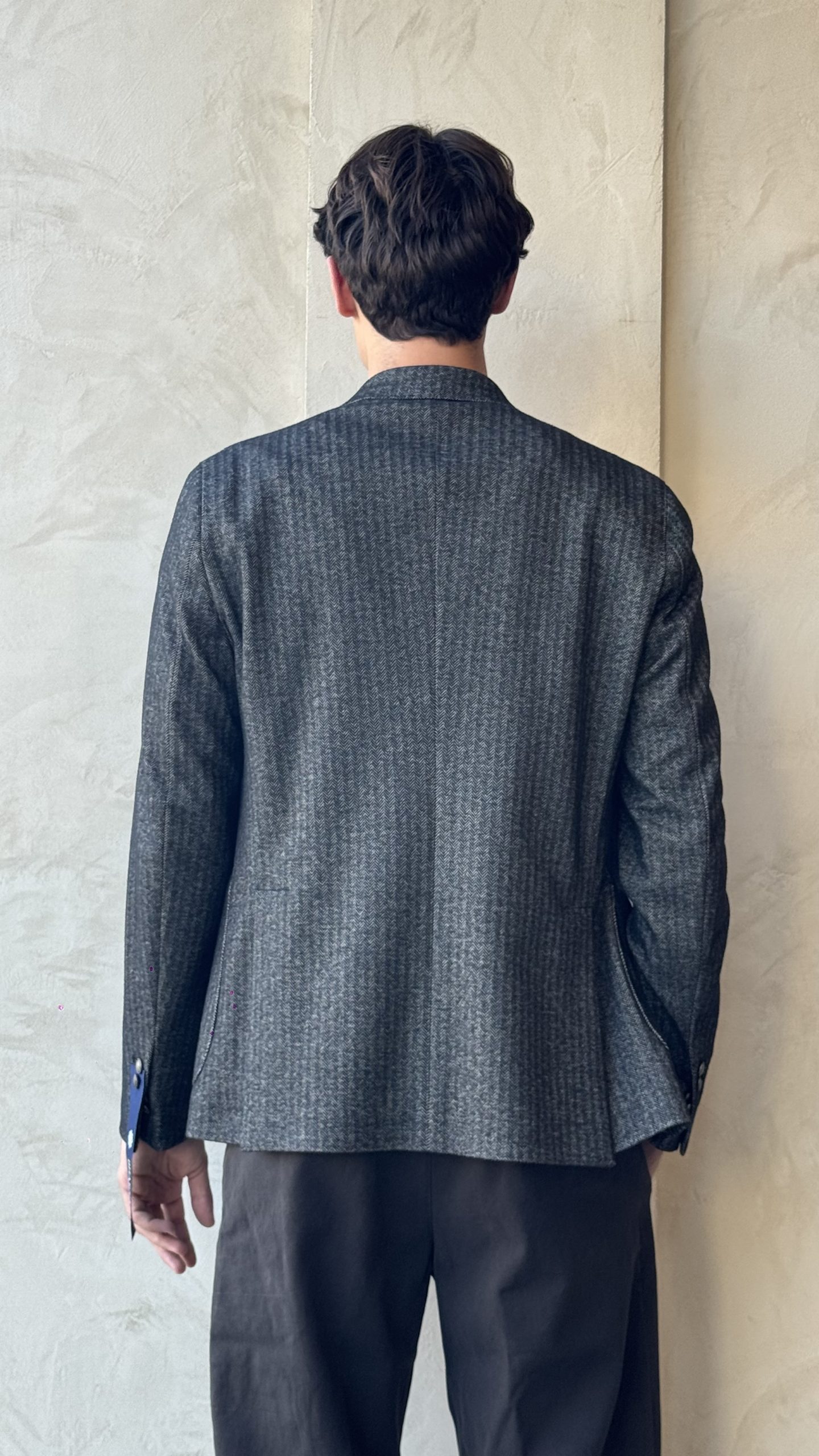 Giacca doppiopetto, fantasia spigata sul color fango, sfoderata, due tasche e taschino con pochette, fit regolare