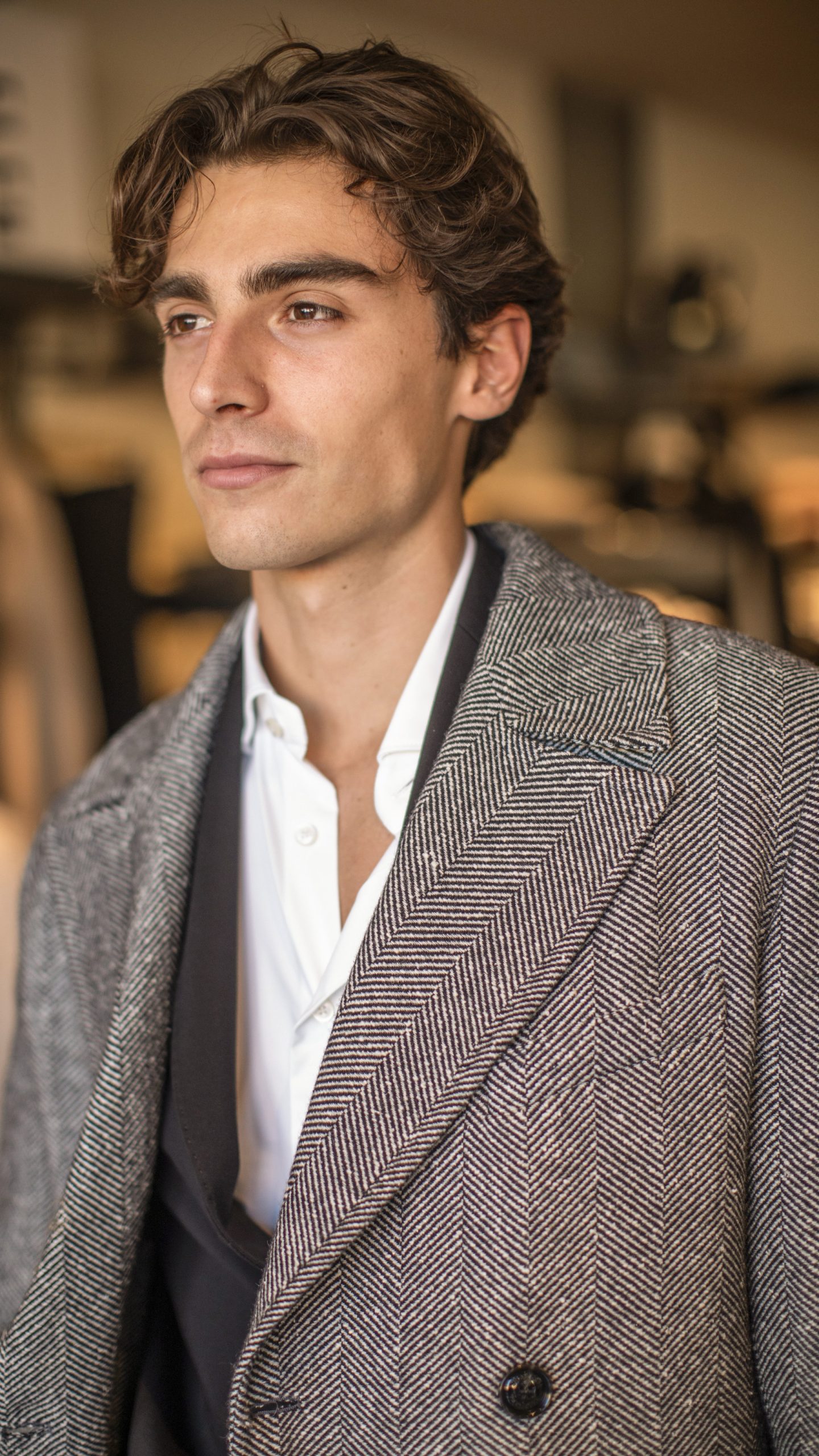 Realizzato con linee sartoriali impeccabili, caratterizzato da un revers ampio che conferisce un tocco di classe senza tempo e da una chiusura a doppiopetto con bottoni scuri che ne esaltano la struttura.