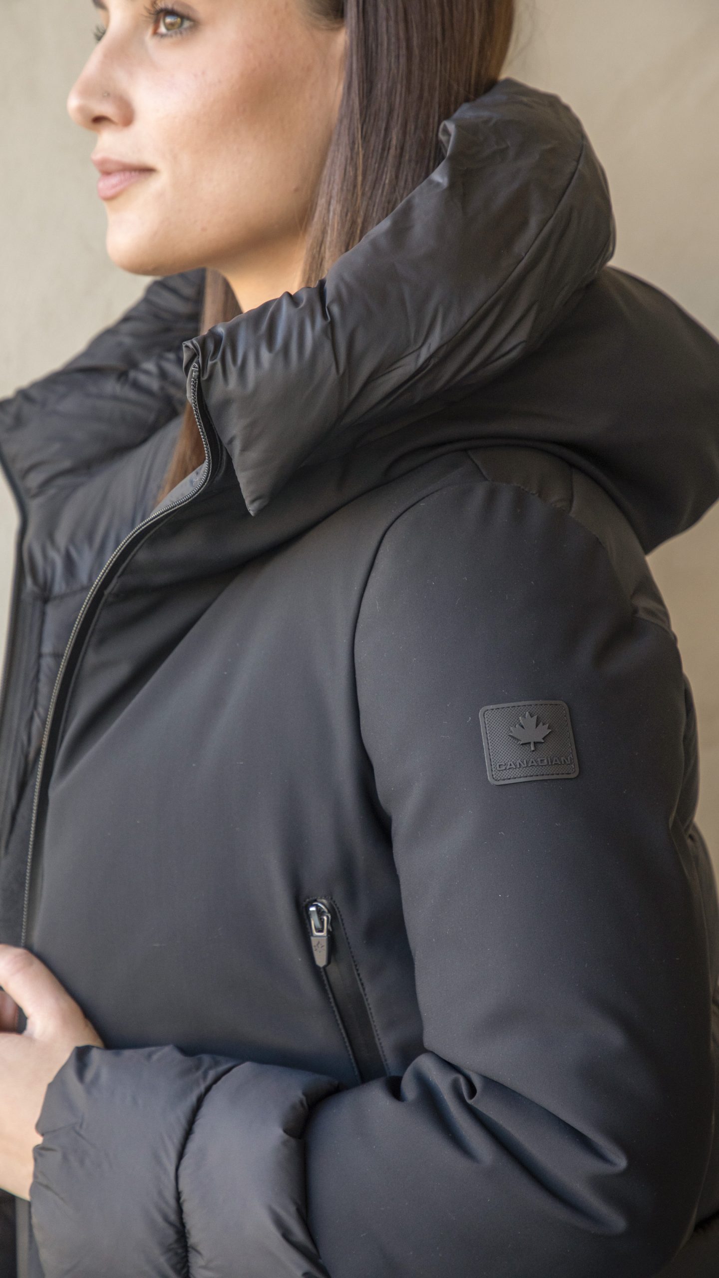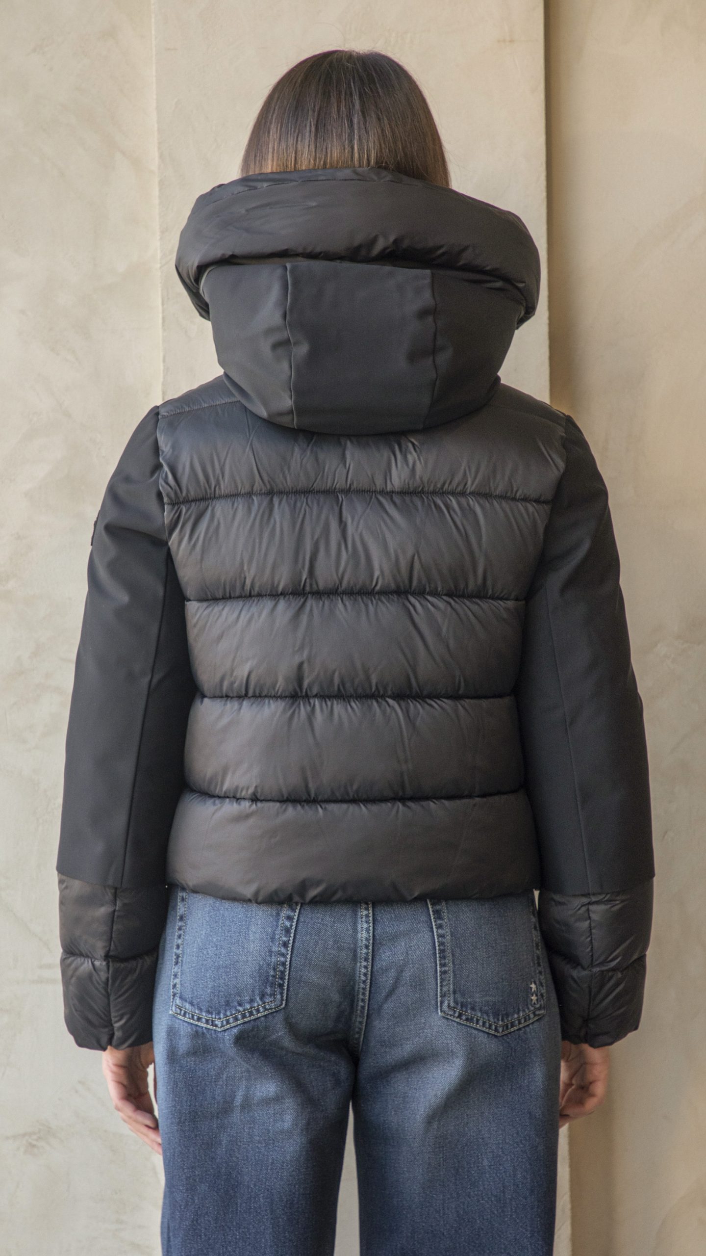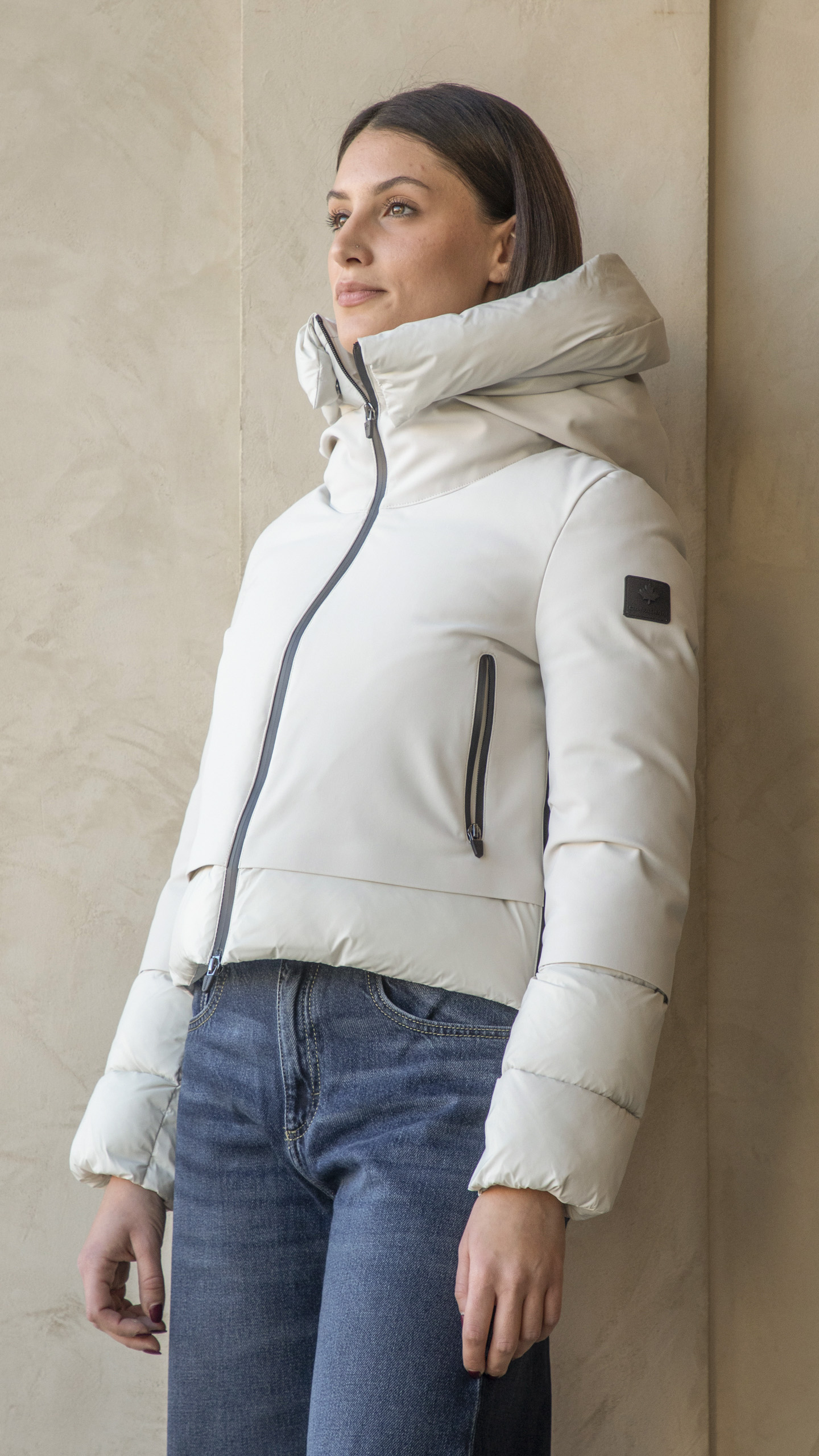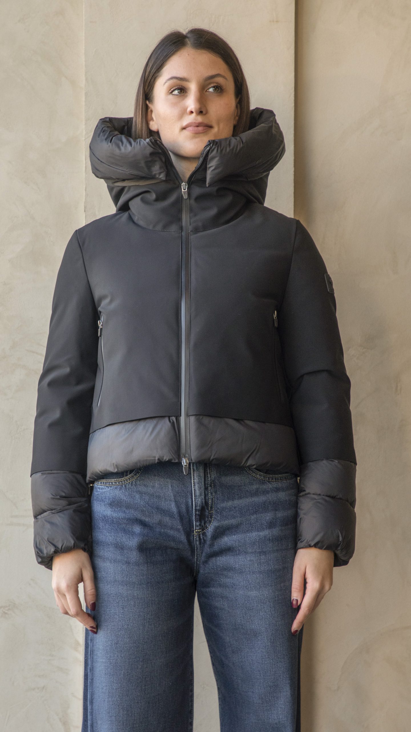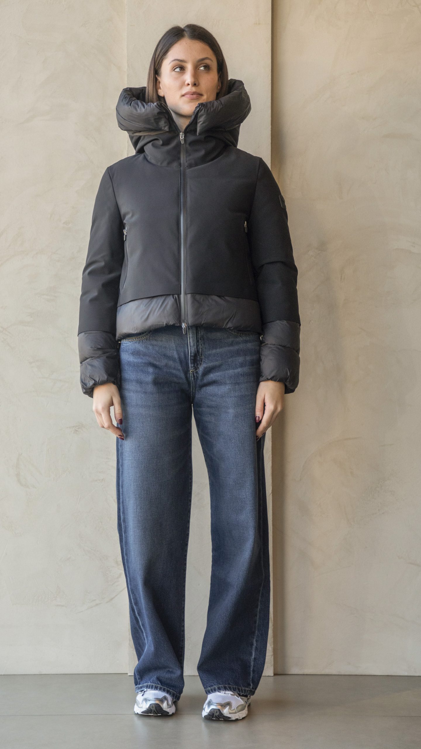 In nylon idrorepellente, elasticizzato ed estremamente traspirante, dalla vestibilità molto femminile: corto e stretto in vita, chiusura con zip a doppio cursore, tasche laterali e cappuccio integrato.