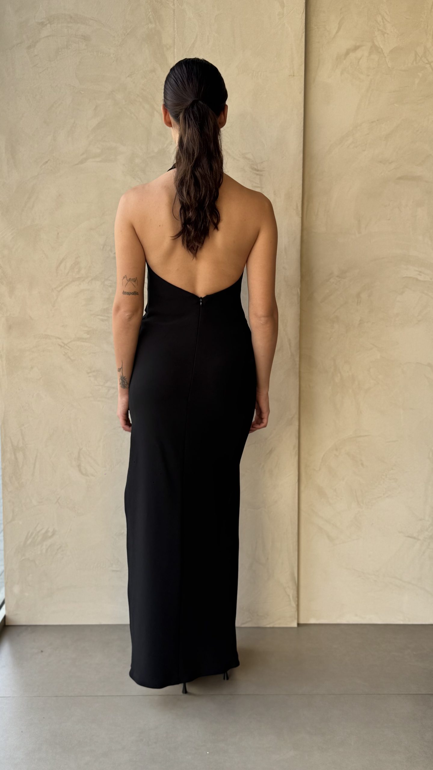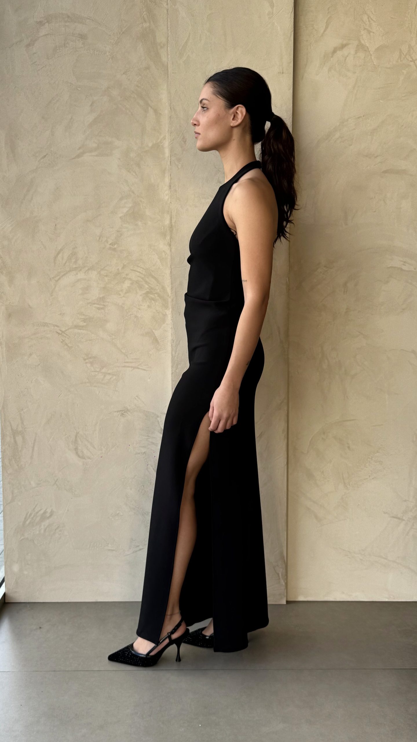 Abito lungo con spacco laterale, chiusura all’americana con bottoncini tono su tono e zip nel retro. Vestibilità slim tessuto semielasticizzato.
