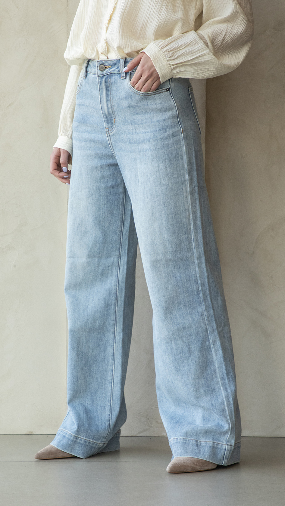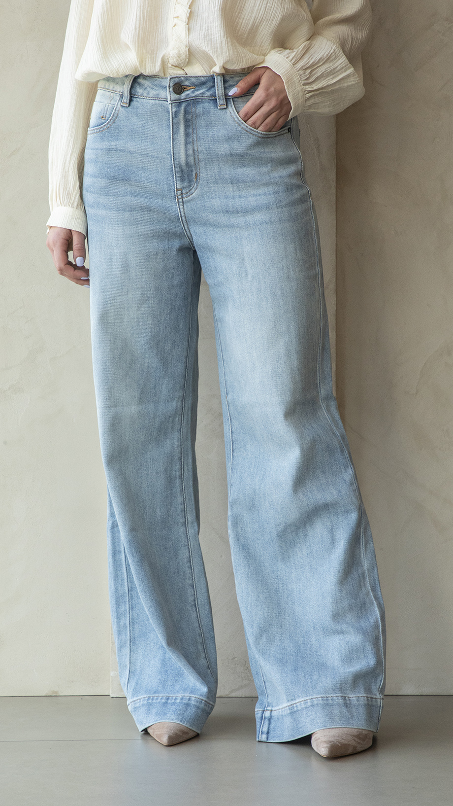 Jeans lavaggio chiaro, over fit, gamba morbida e dritta, quattro tasche, chiusura con zip e bottone matallico con logo.