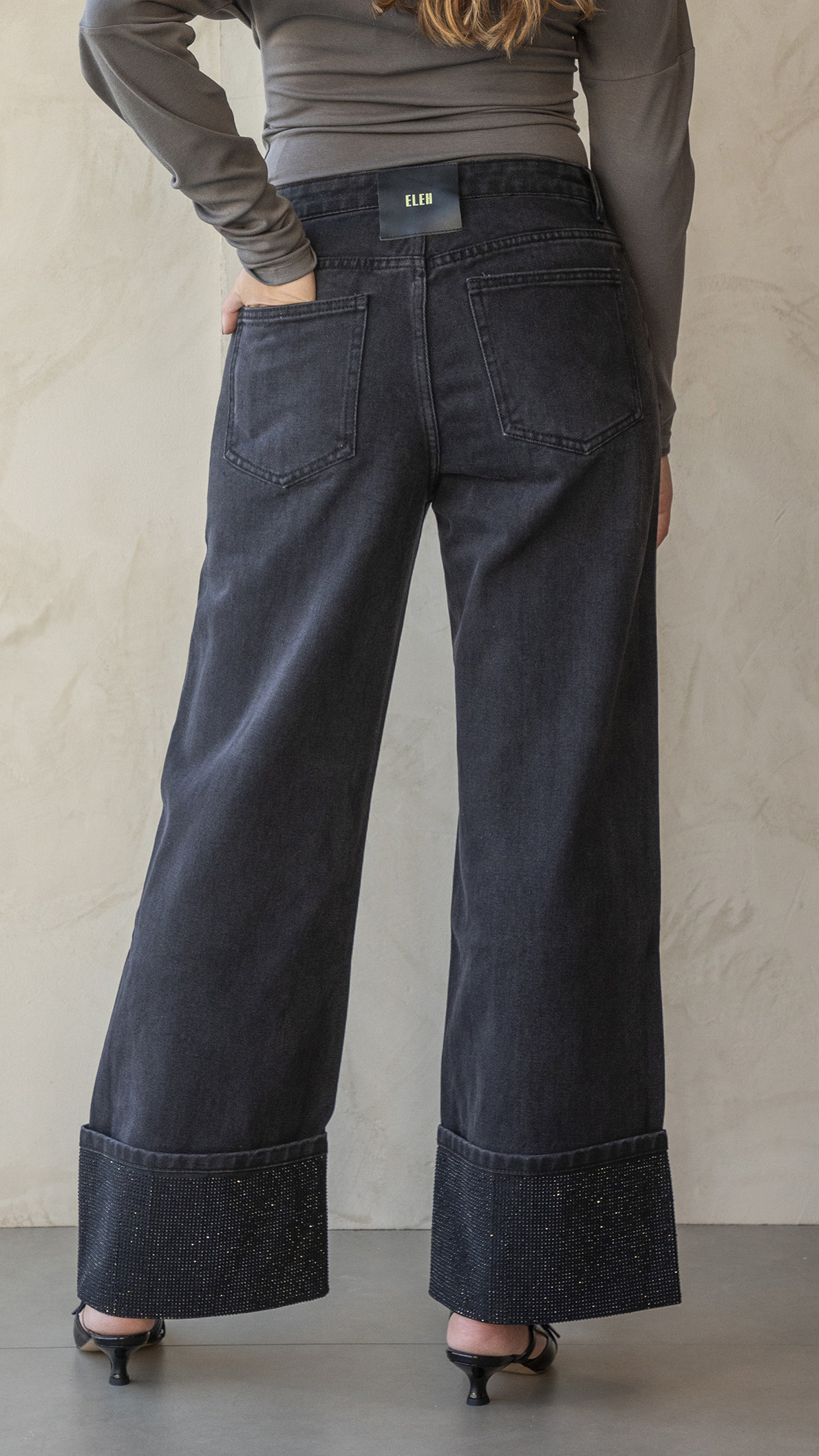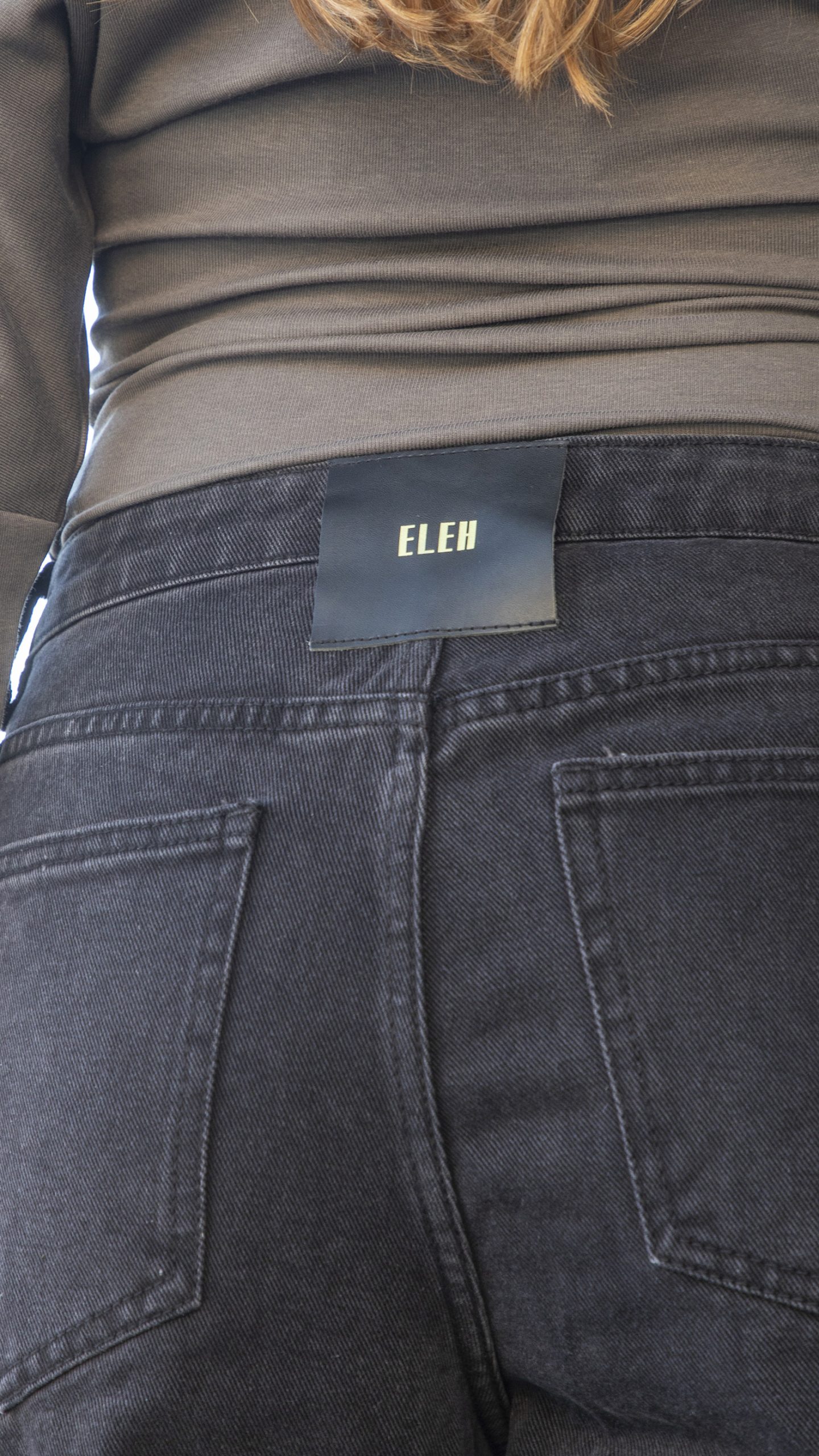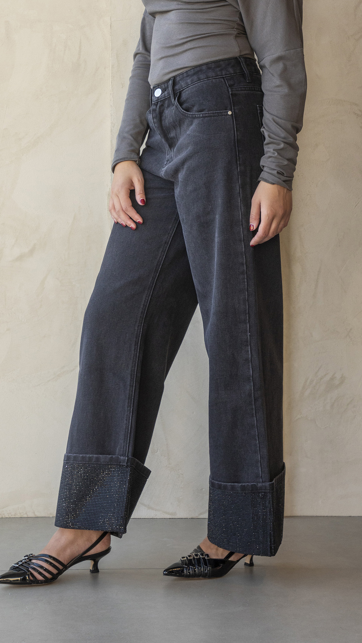 Denim lavaggio black stone, vestibilità dritta, vita alta, 5 tasche.