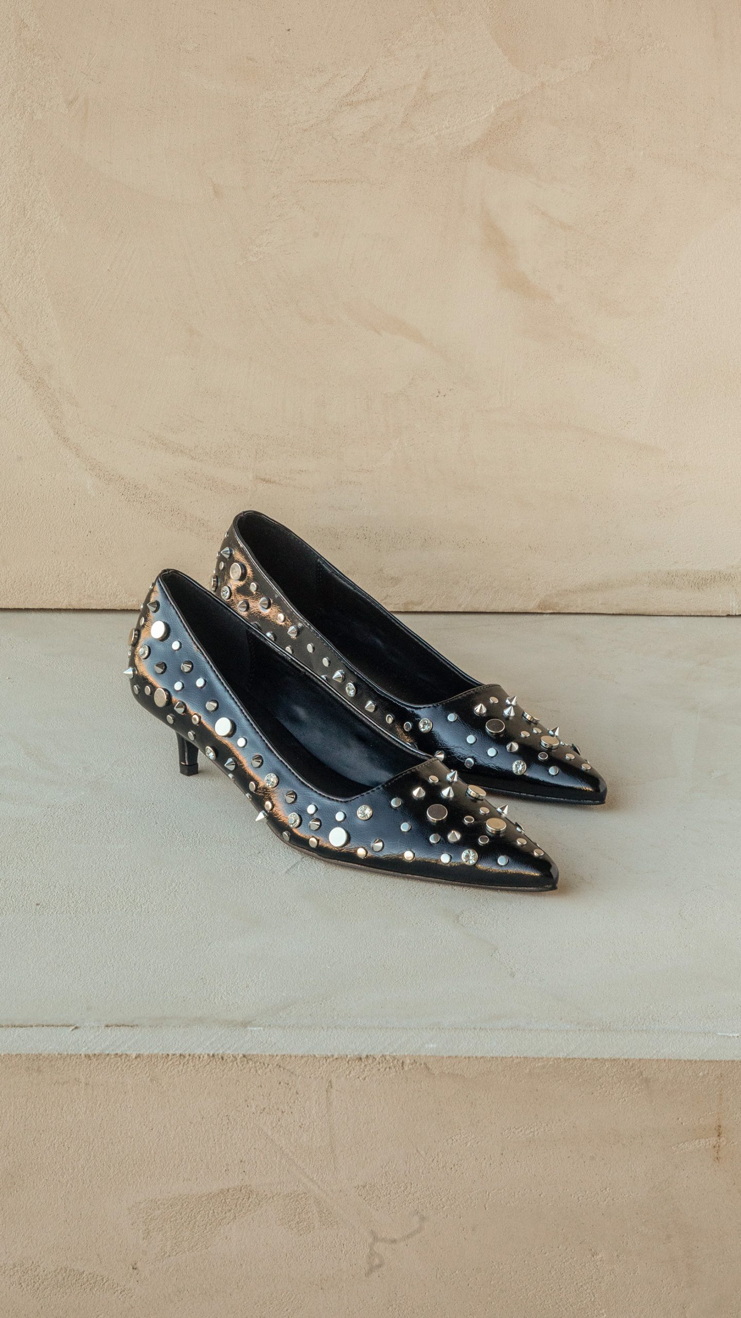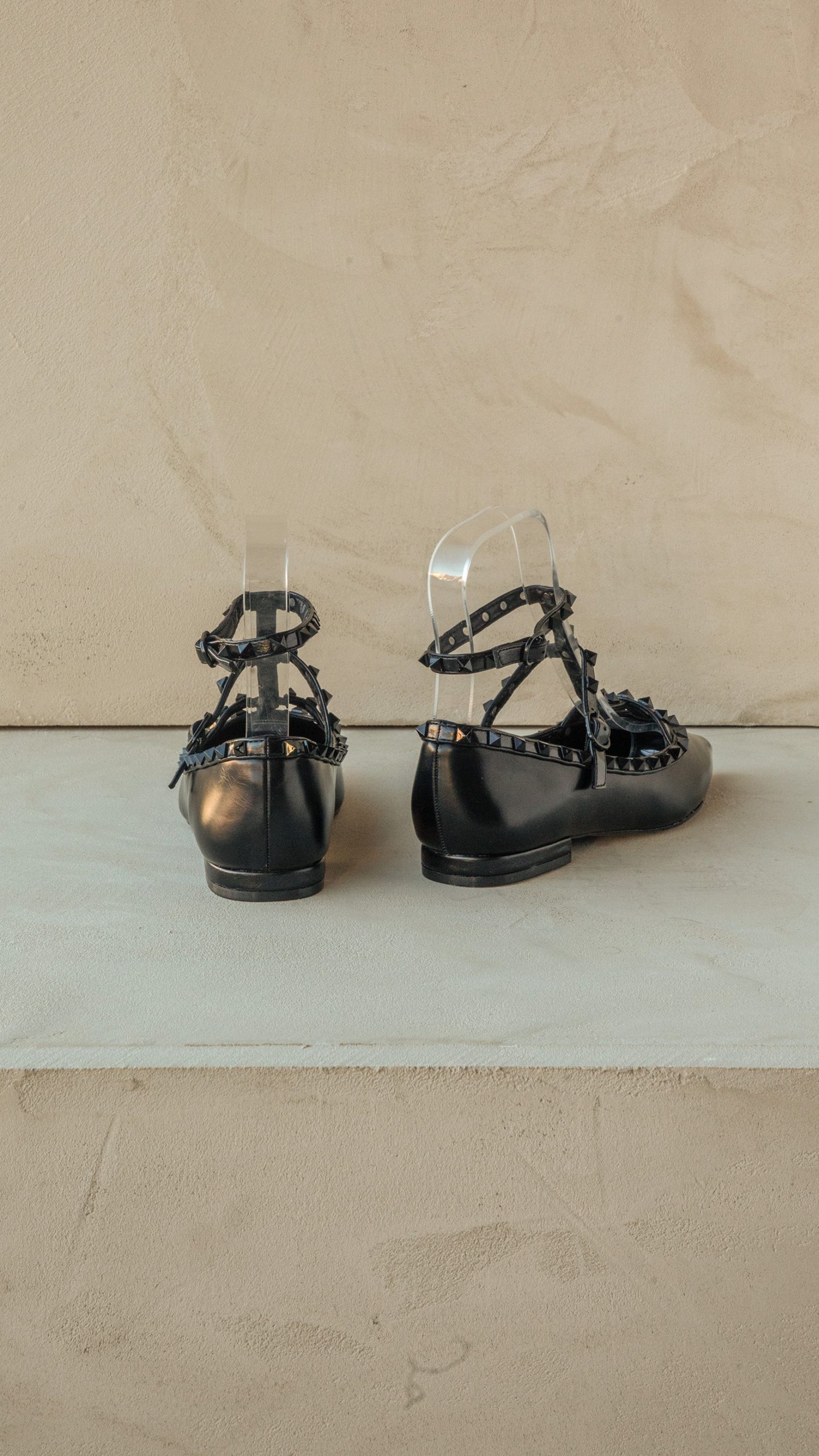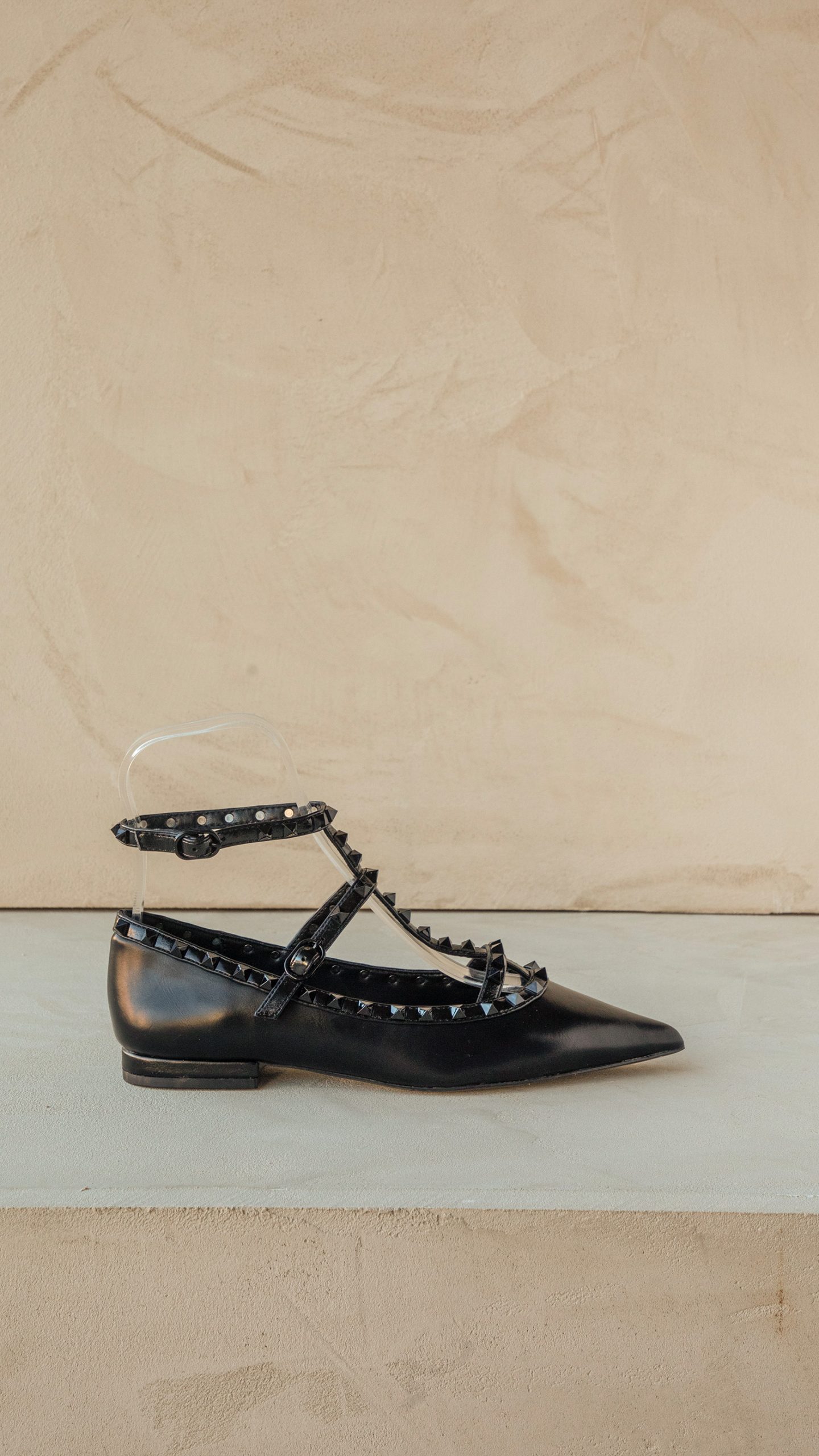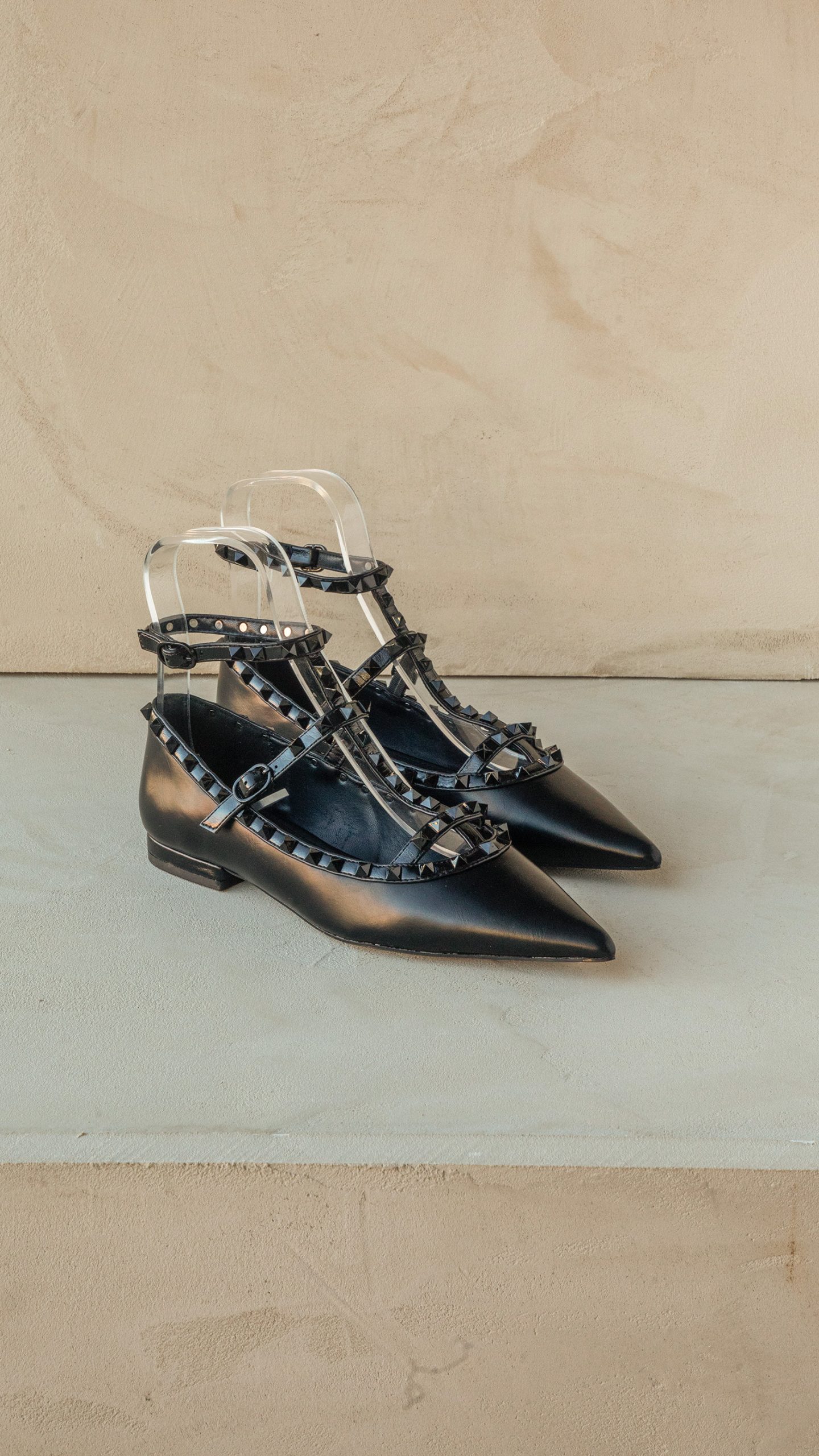 Ballerina a punta con rialzo sul tallone, chiusura con doppia fibbia ed applicazione di borchie tono su tono lungo la profilatura. Suola imbottita per garantirne il massimo comfort. Perfetta per i vostri look piu casual e nelle occasioni formali.