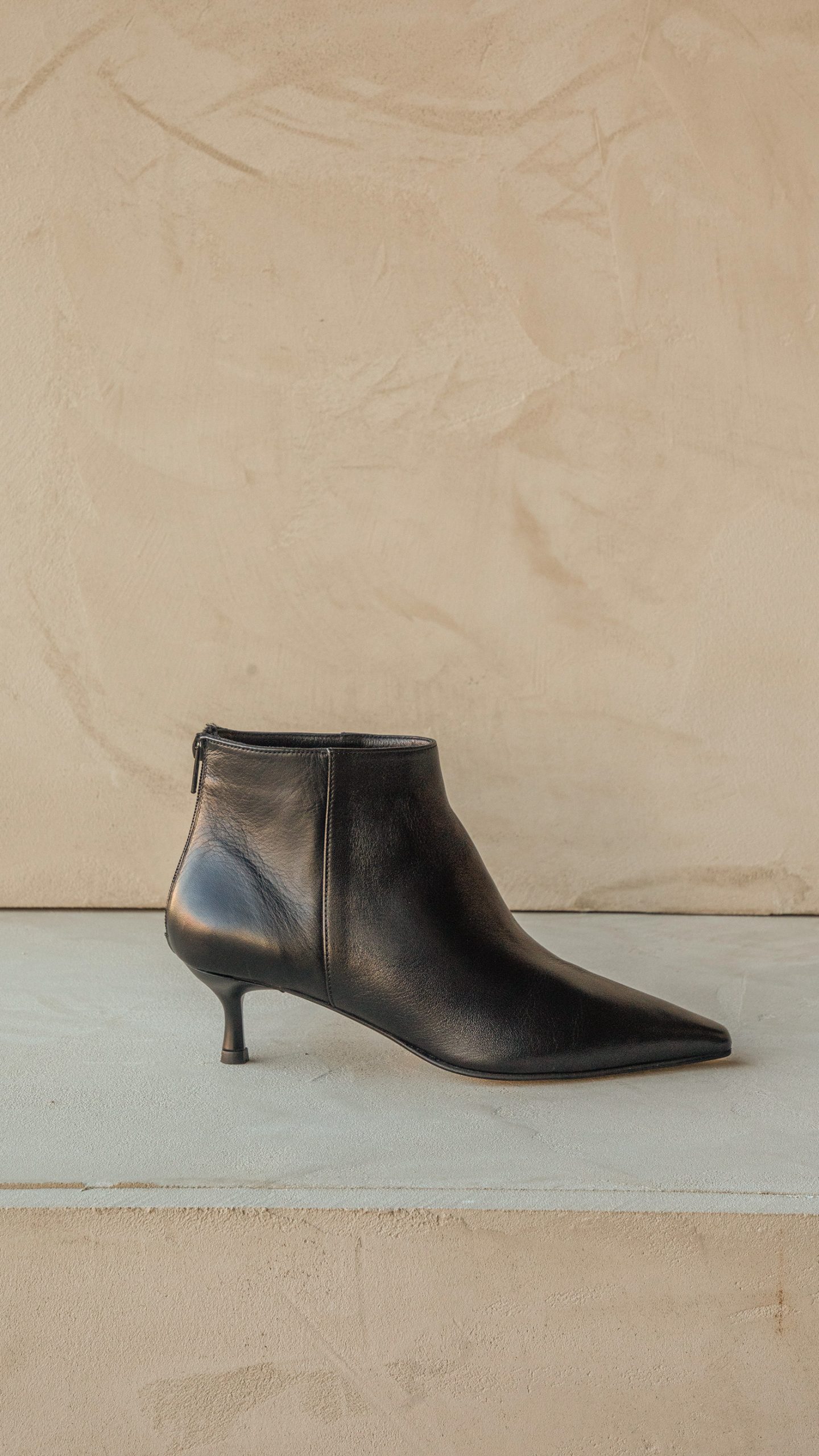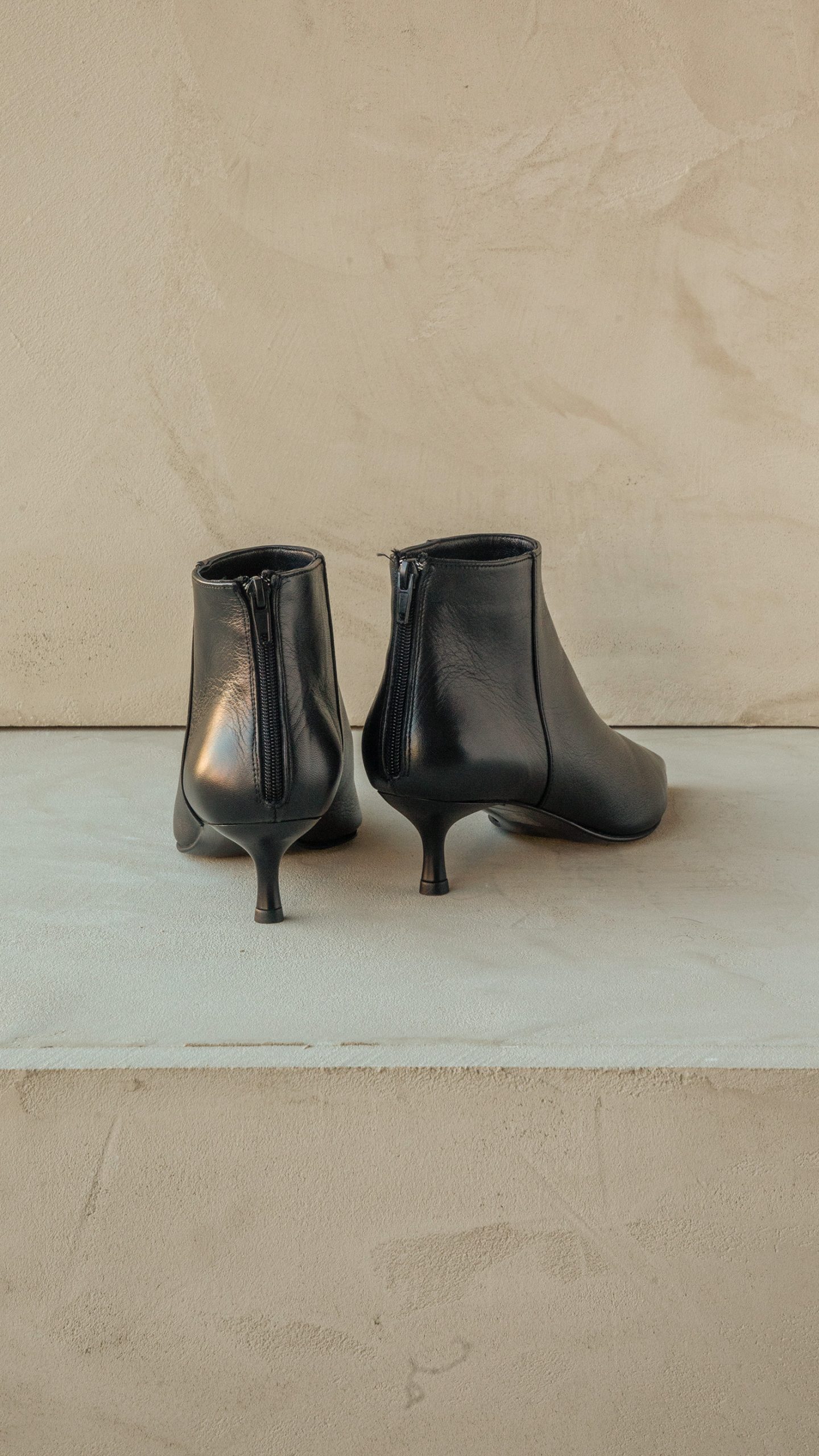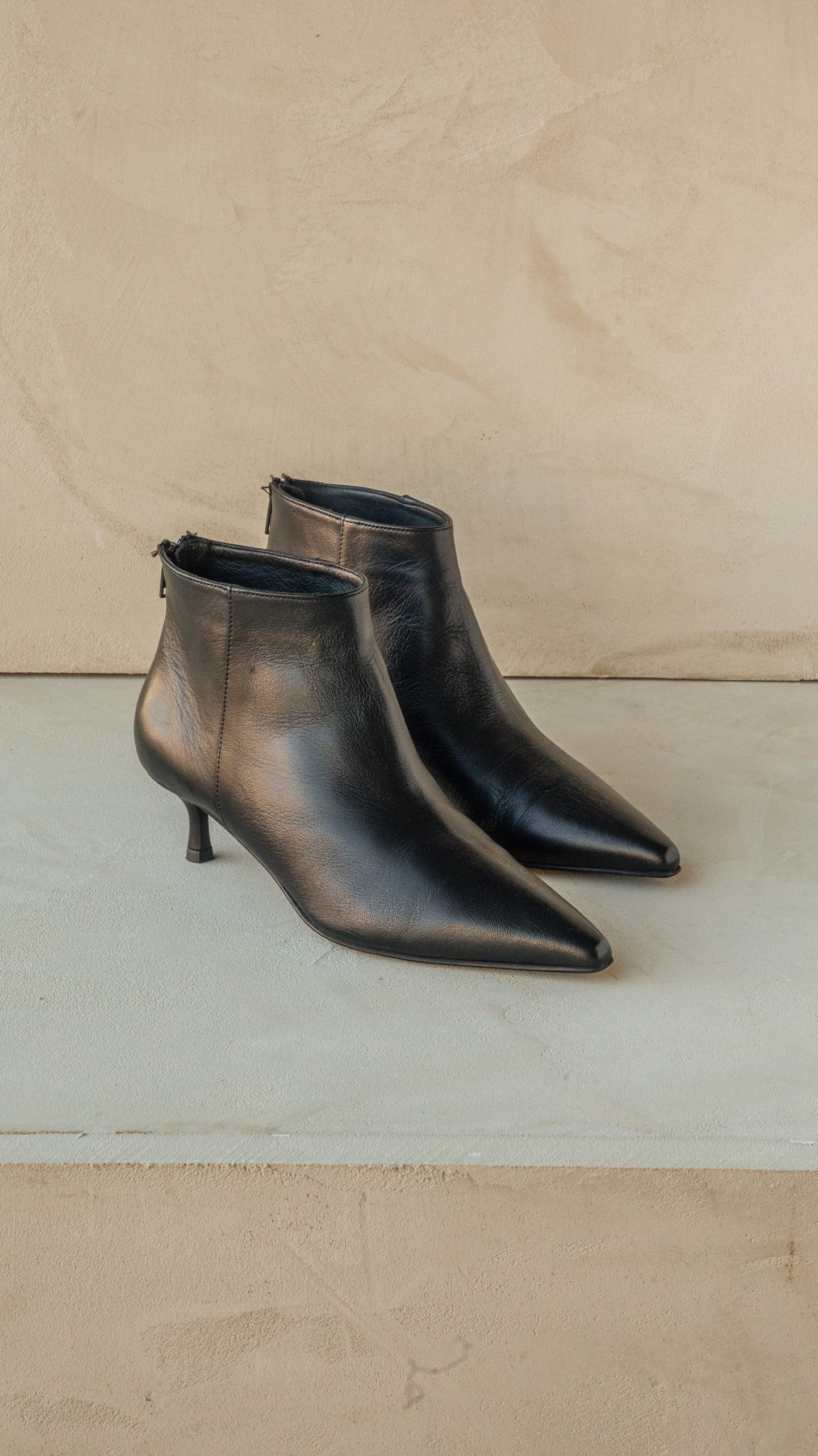 Tronchetto in pelle con chiusura a zip sul retro, altezza tacco 5 cm.