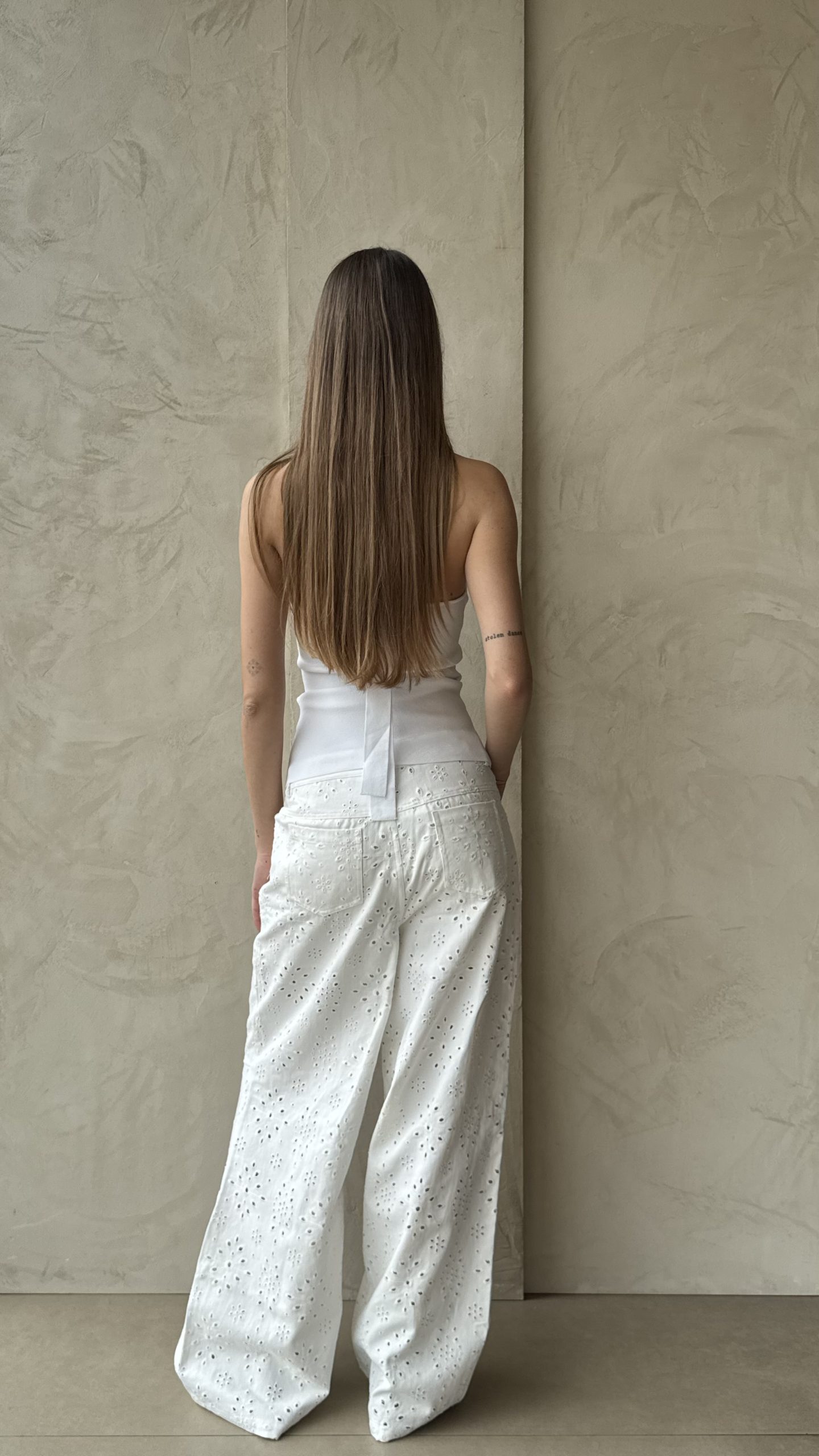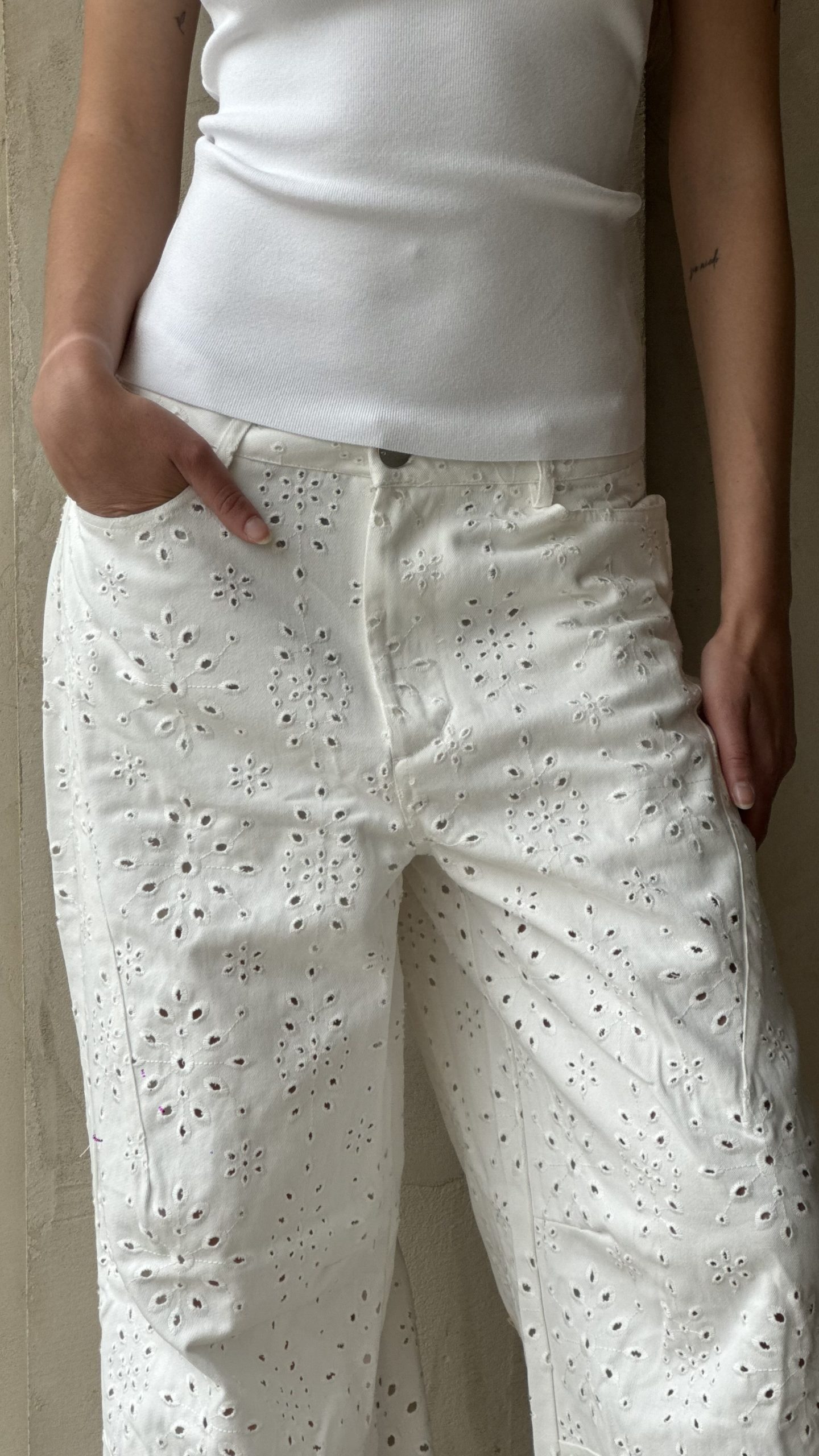Pantalone in pizzo sangallo, taglio jeans, 4 tasche, chiusura  frontale con bottone in metallo logato e zip a scomparsa, vestibilità over.