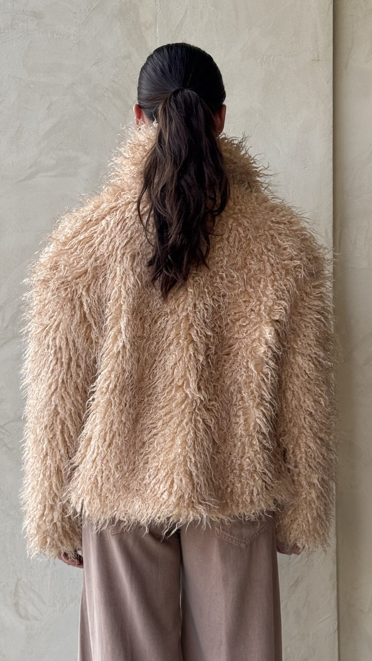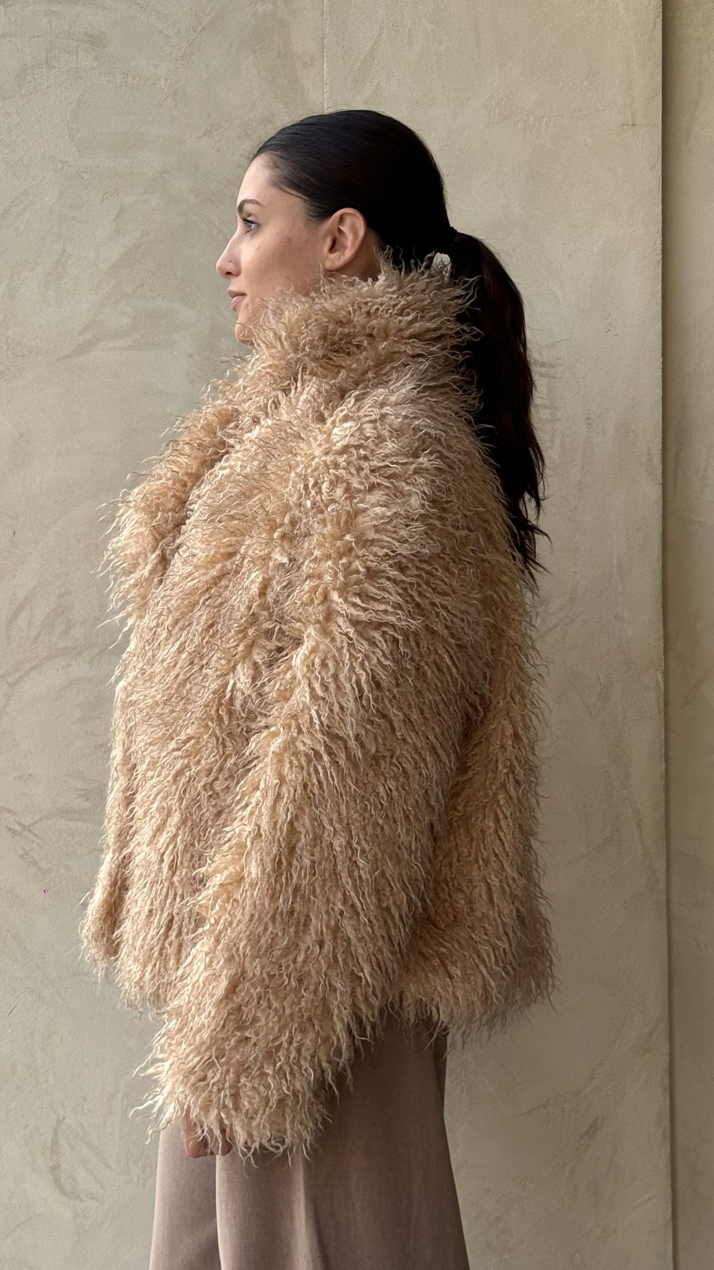 Eco fur mongolia, realizzata in tessuto sintetico, manica lunga, vestibilità comoda, lunghezza regolare texture voluminosa, foderata