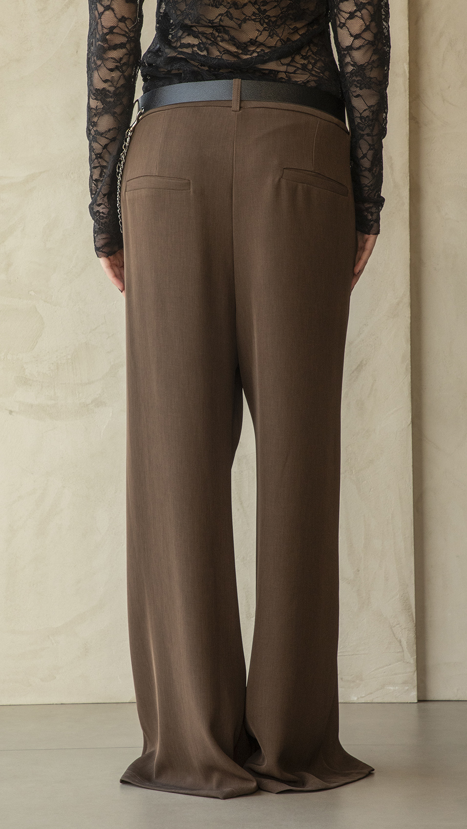 Taglio a palazzo in tessuto super fluido, tasche laterali a scomparsa, e a filetto dietro, chiusura con zip e bottone madreperla, cintura in ecopelle con catena inclusa.