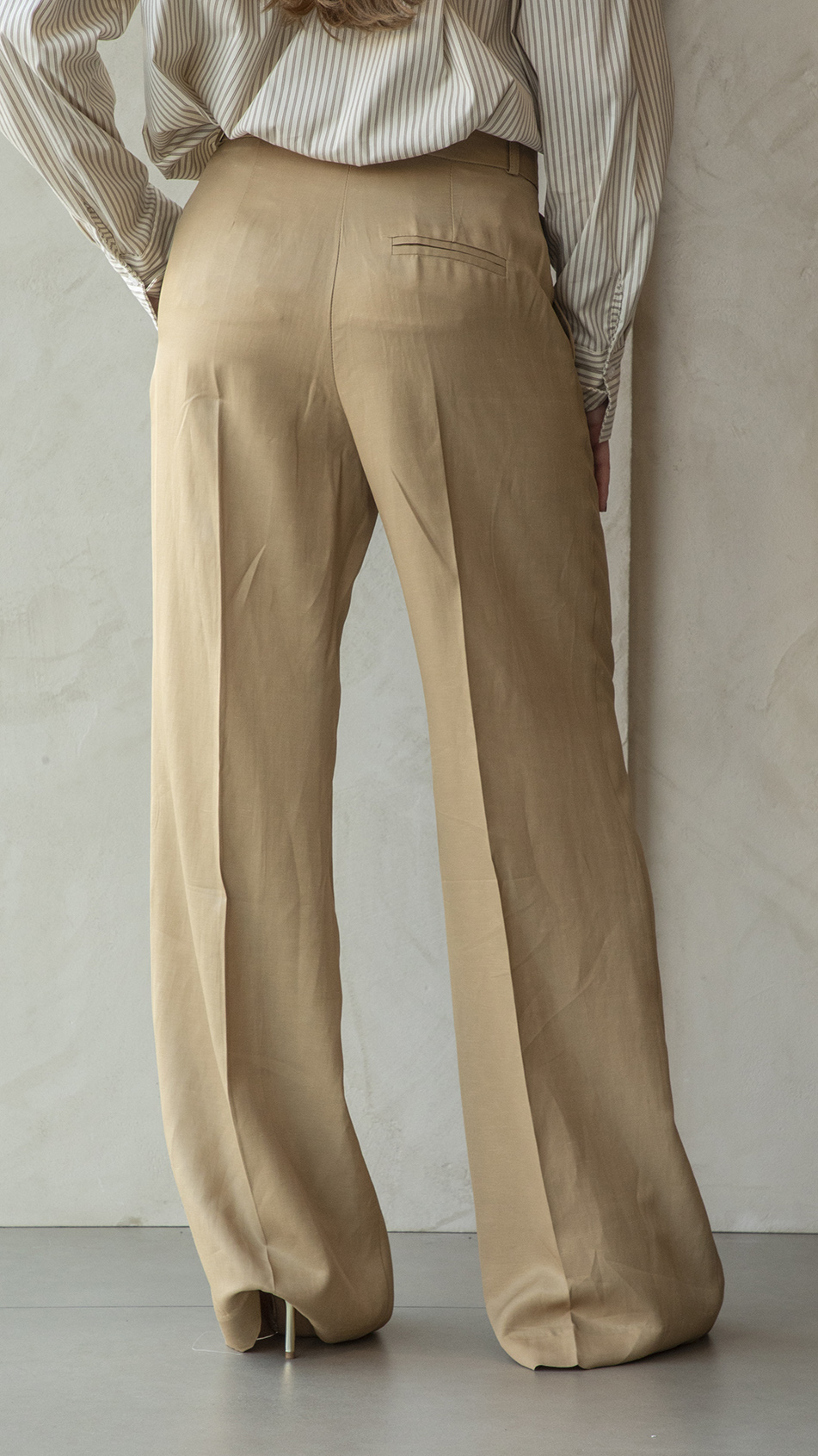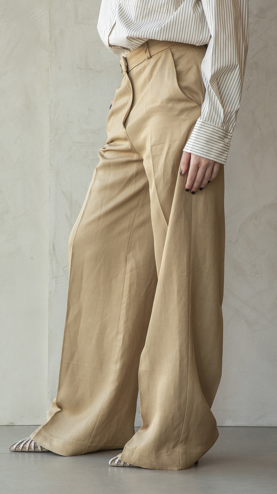 Pantalone dal taglio palazzo, tasche oblique sul fianco e una a filetto nel dietro, vita alta, chiusura con zip e bottone frontale, cinturino con passanti. Colore miele tessuto lucido.