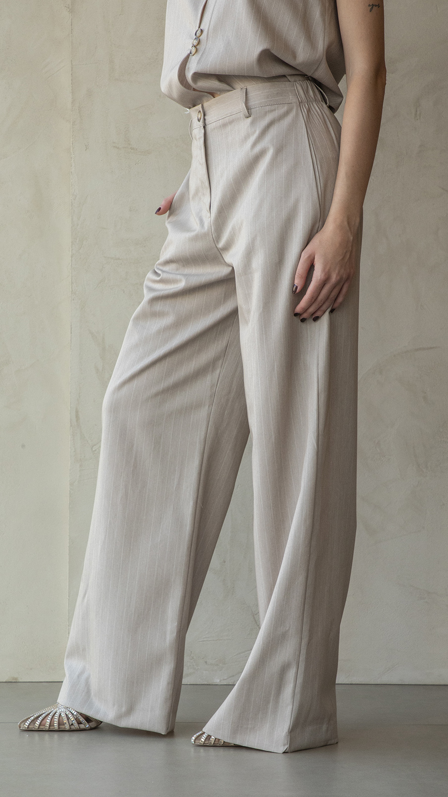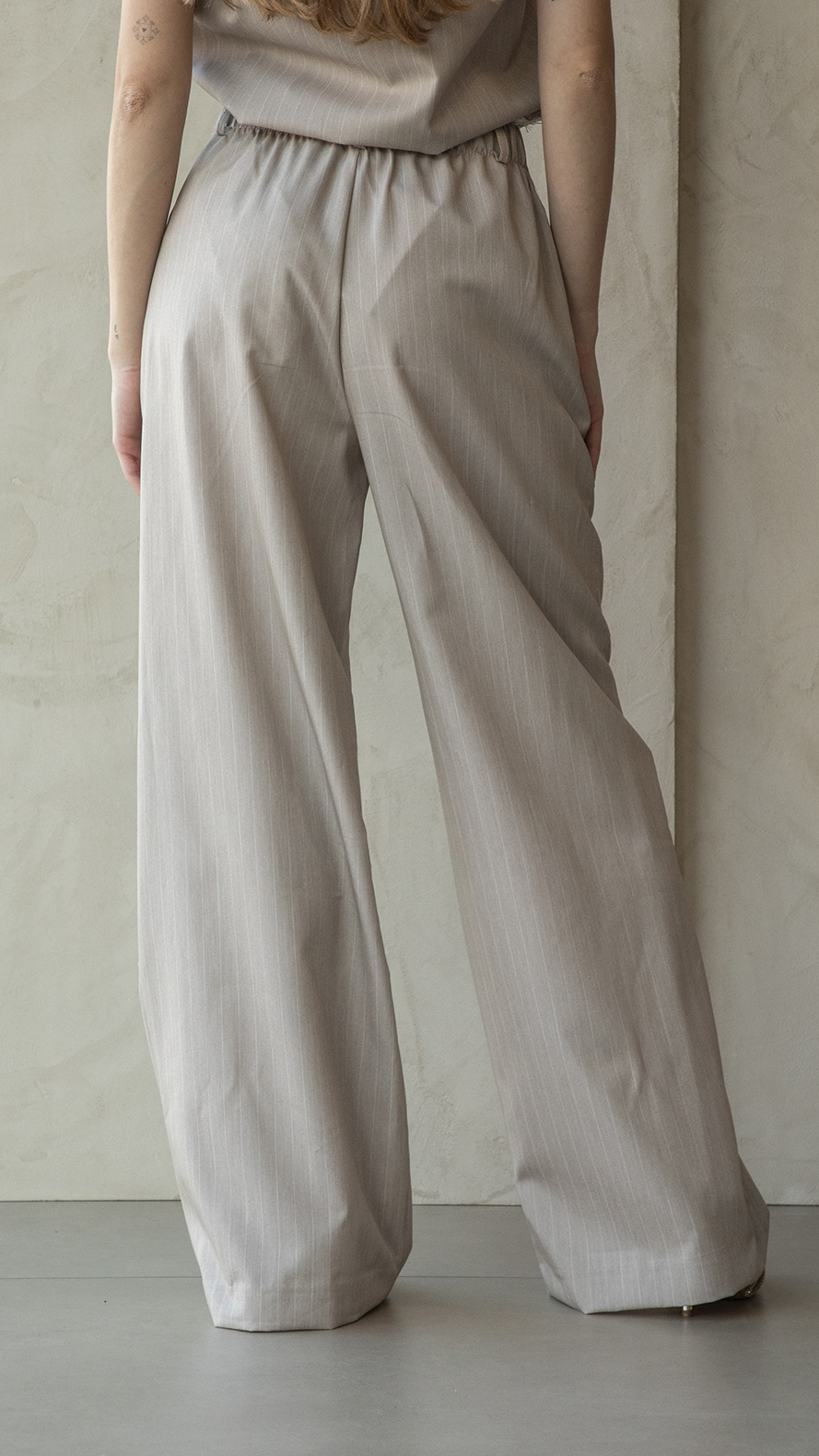 Pantalone a palazzo con micro riga, elastico in vita sul retro, cinturino con passanti