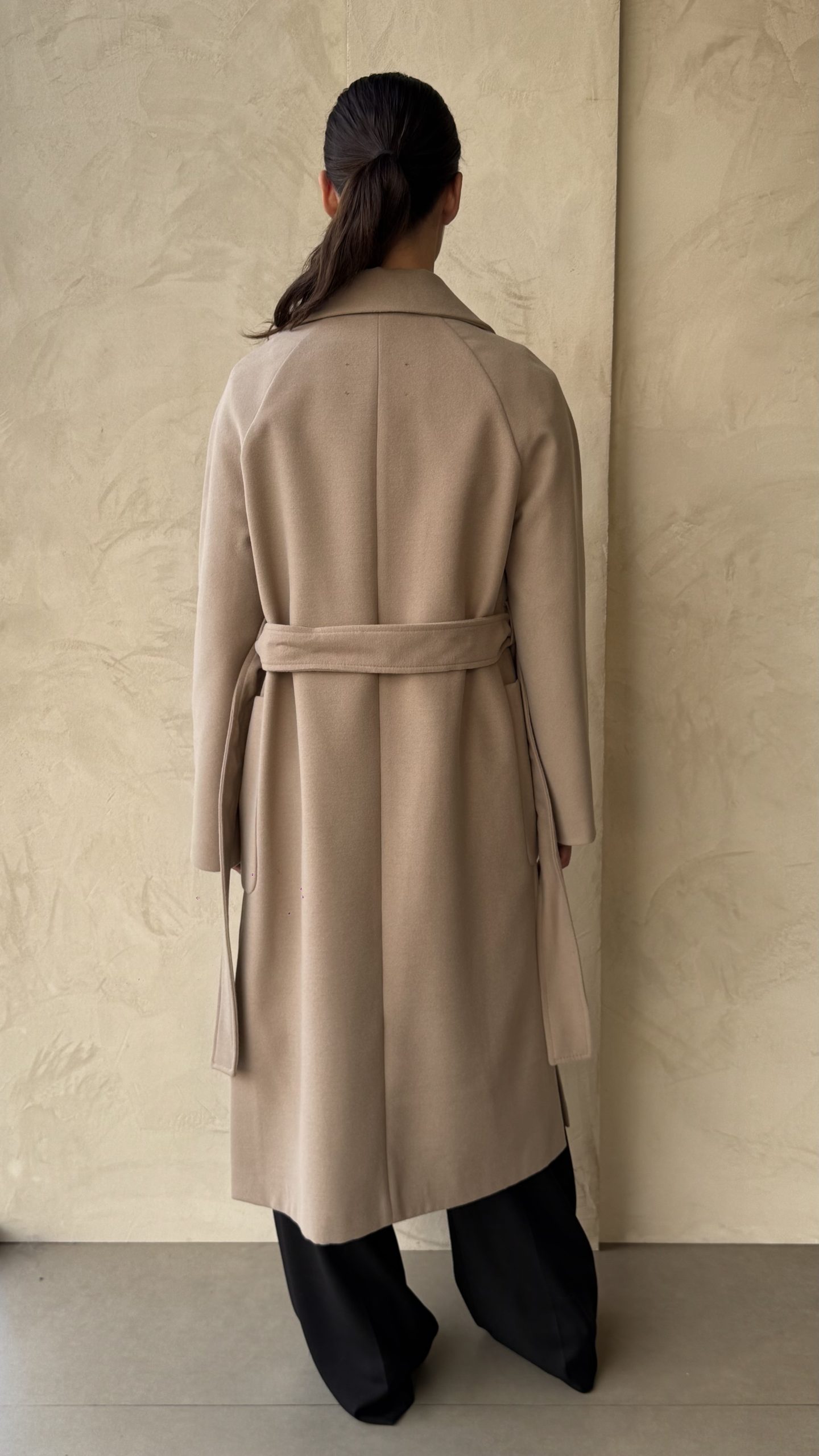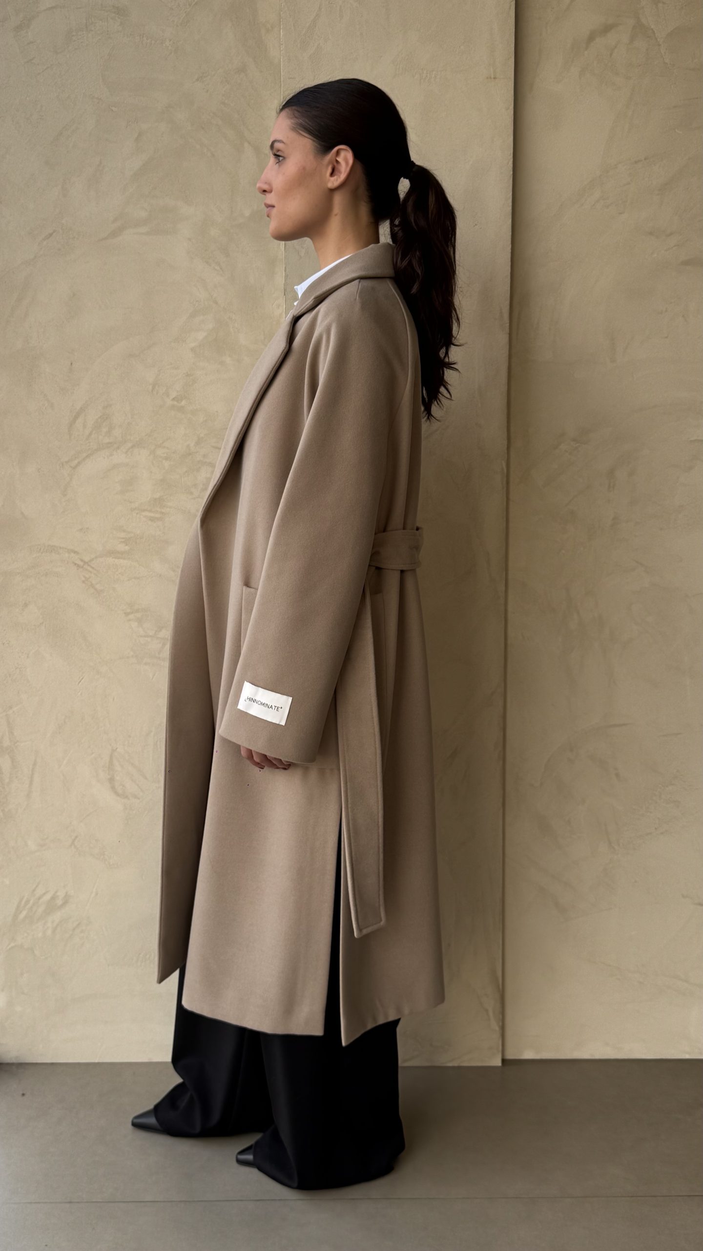 Cappotto in panno , modello accappatoio con cintura, no bottoni, due tasche davanti, patch con logo sulla manica.