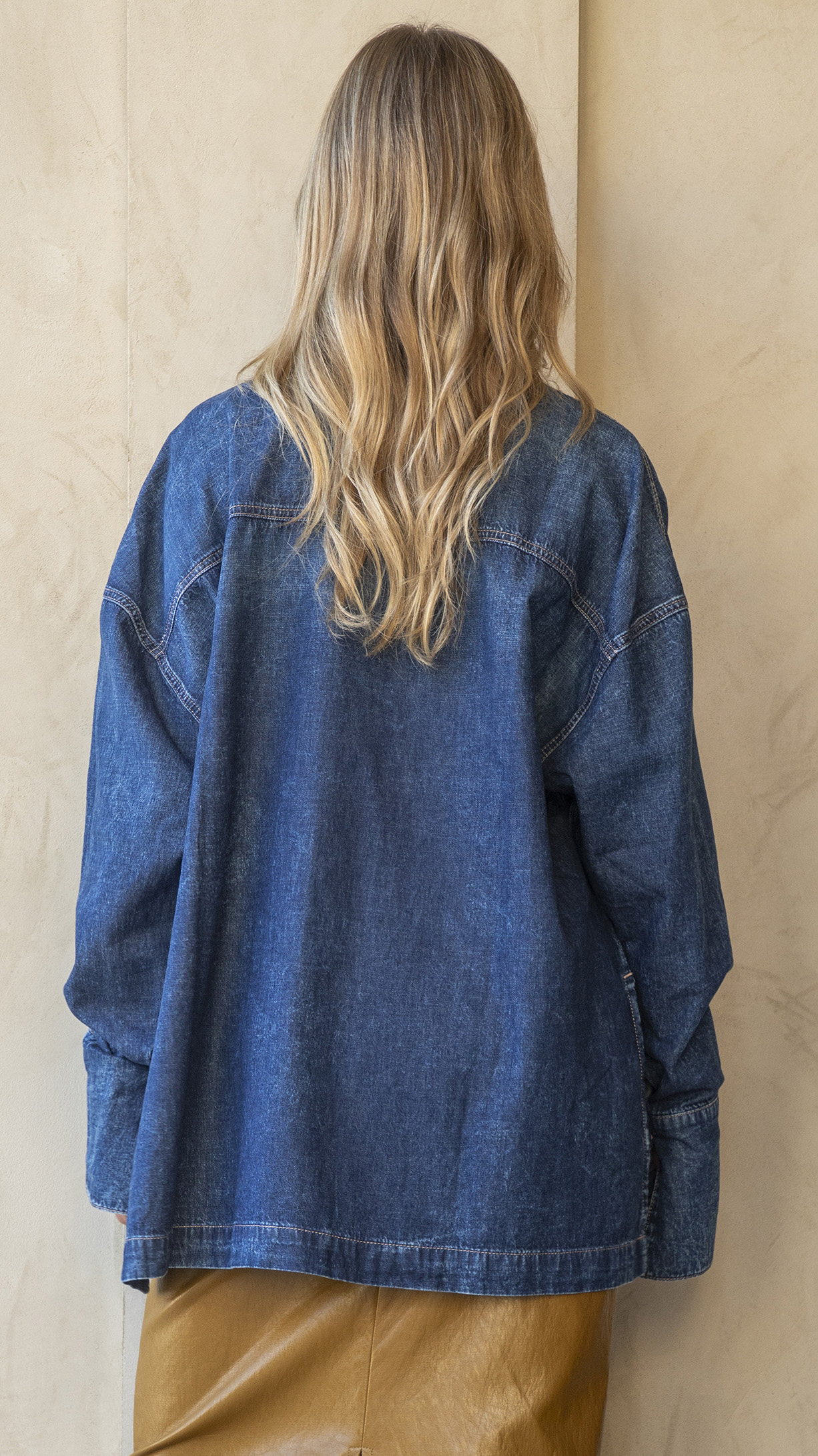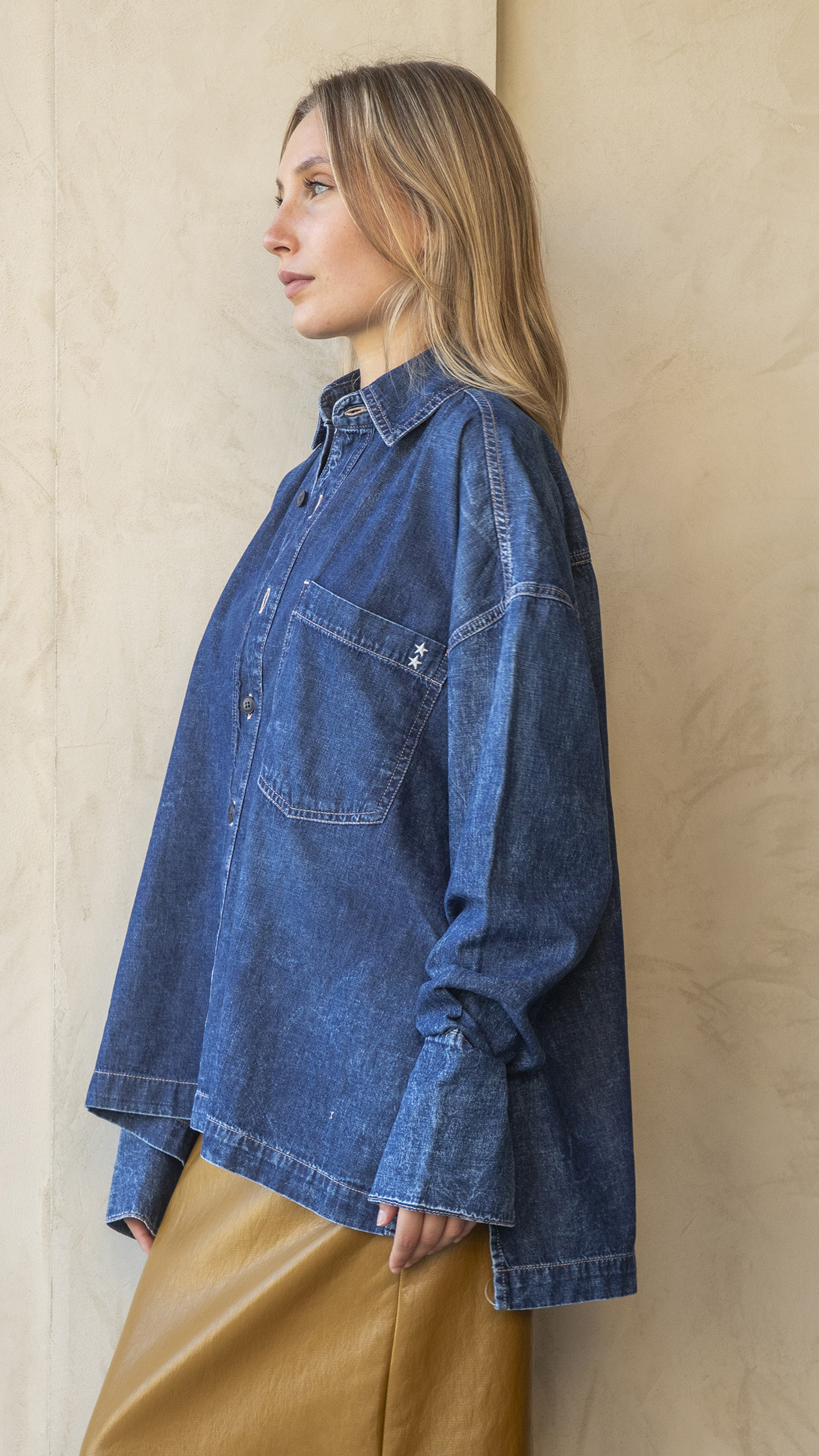 Camicia in denim vestibilità over, lavaggio blu scuro, bottoni neri, taschino.