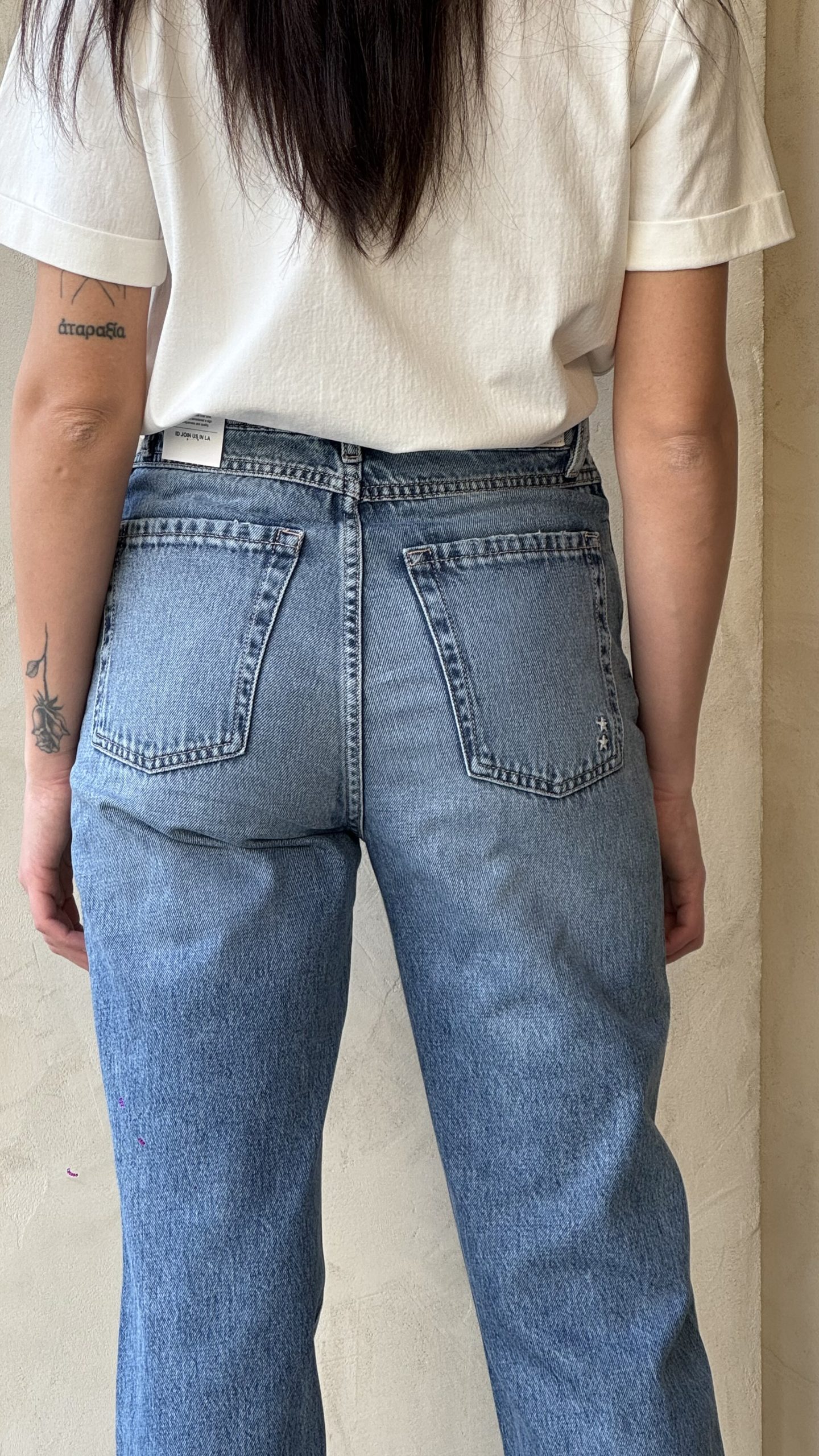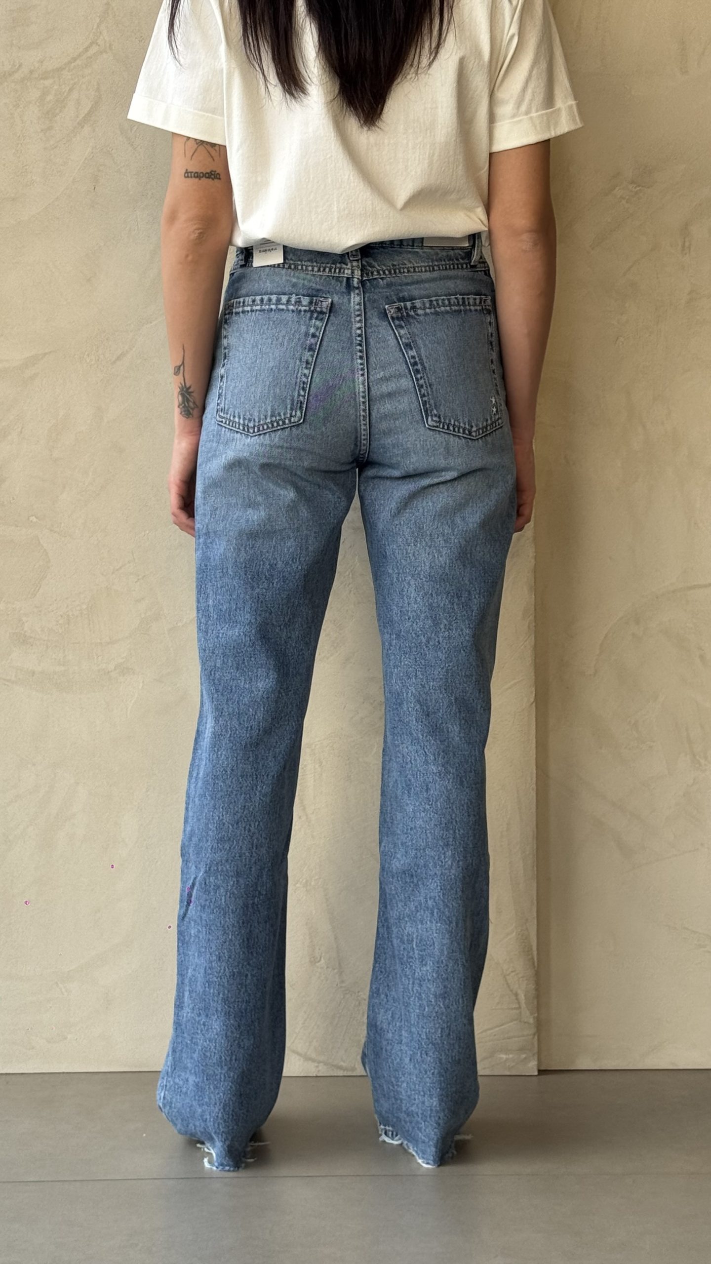 Denim lavaggio medio, con leggere slavature, vita regolare, gamba flare, chiusura con bottone e zip.