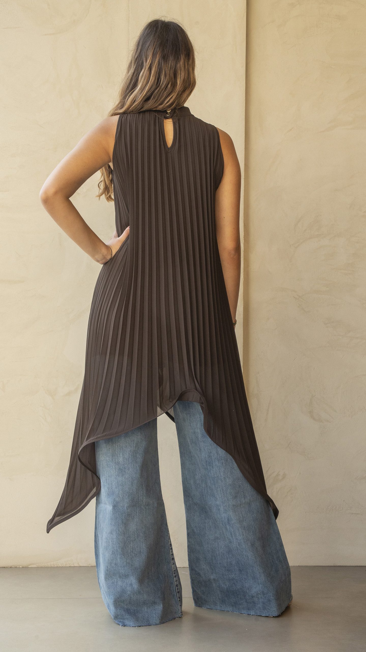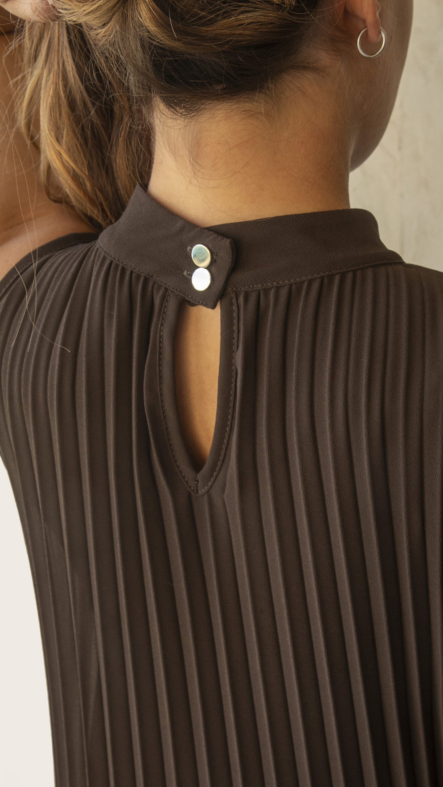 Abito smanicato con mezzo collettino abbottonatura su retro, plissè, vestibilità morbida con sottoveste