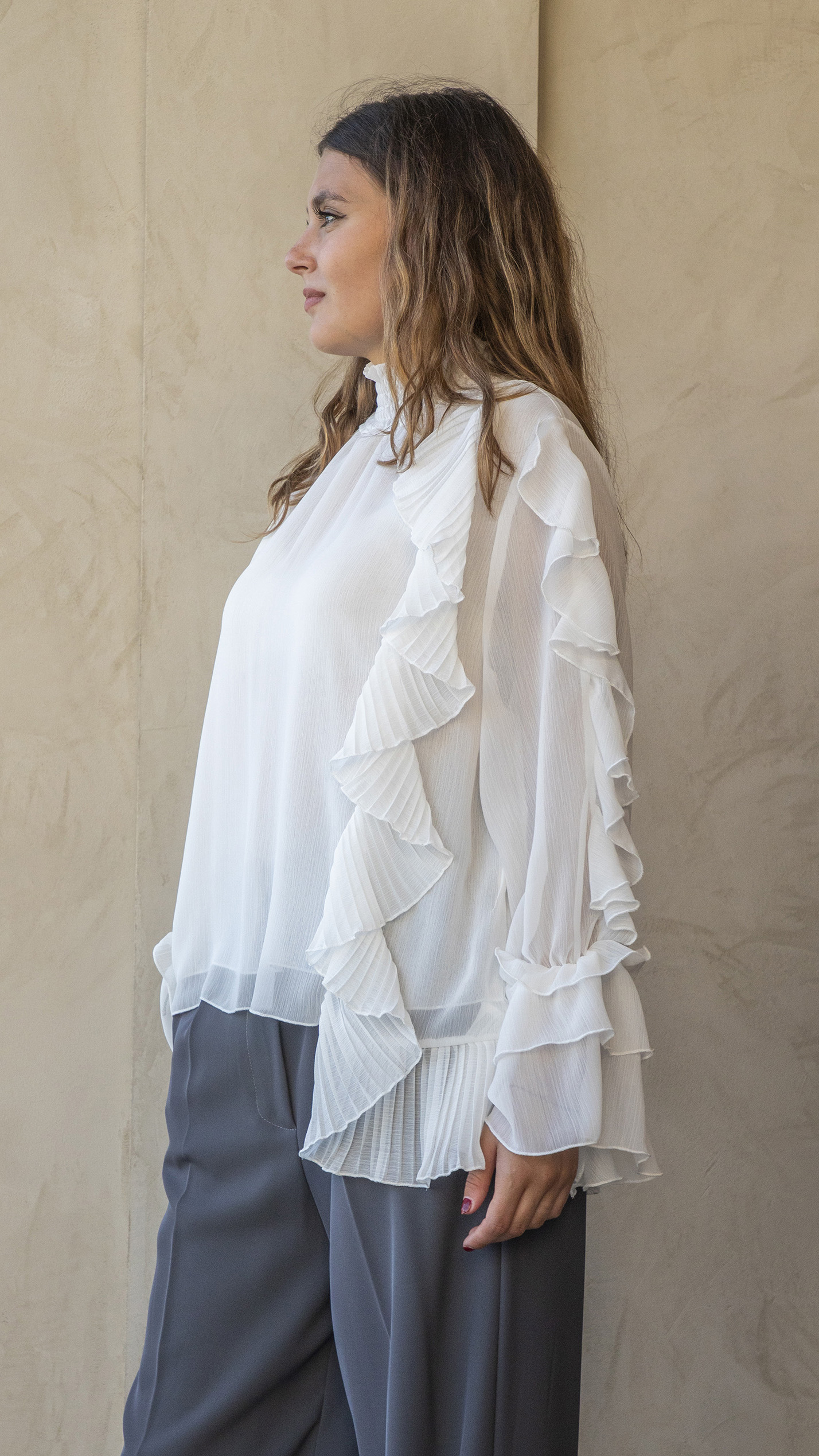 Blusa collo alto drappeggiato, vestibilità molto morbida, rouches su manica