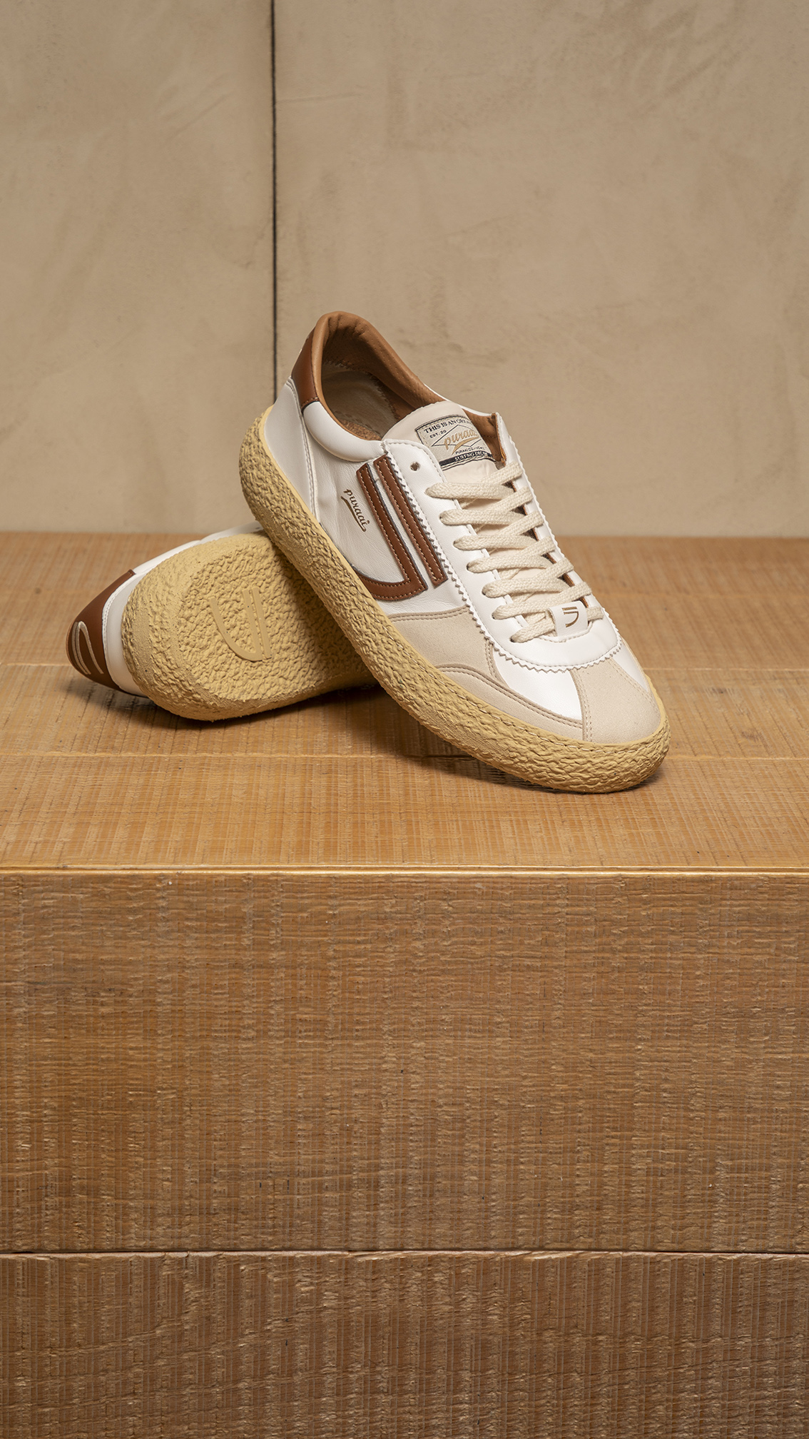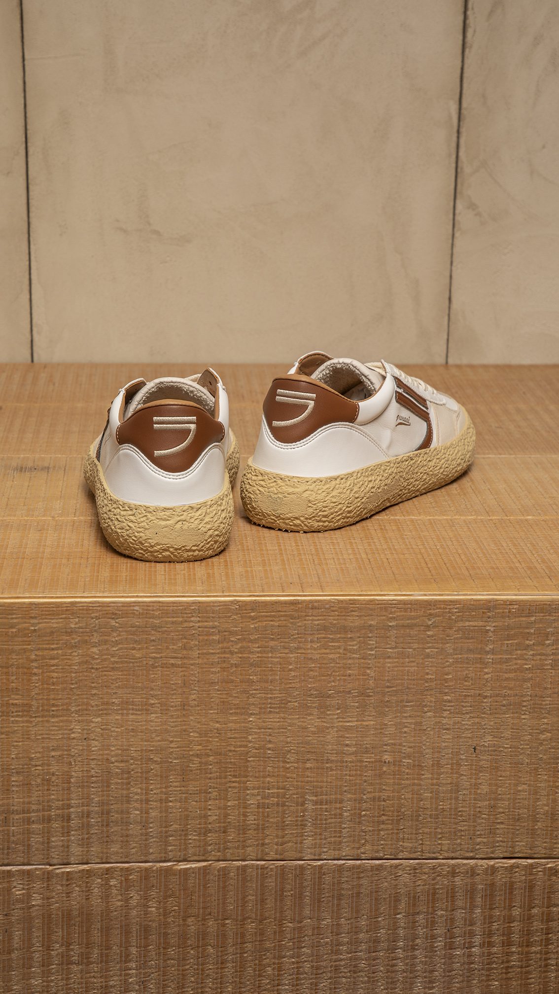 PURAAI Scarpe modello Vintage colorazione Bark in pelle colore bianco con dettagli in marrone. Suola color vaniglia con lacci in cotone avorio.