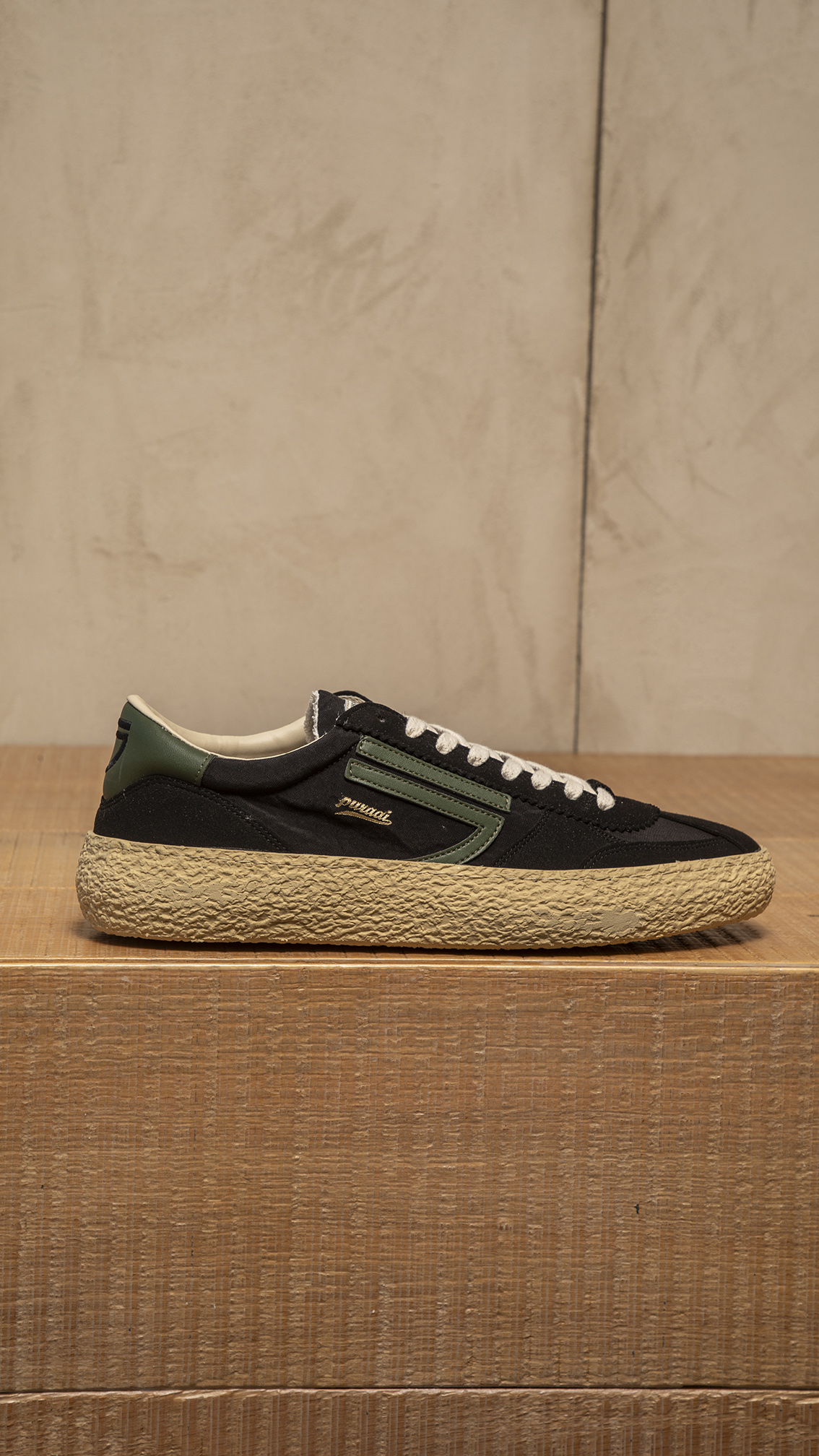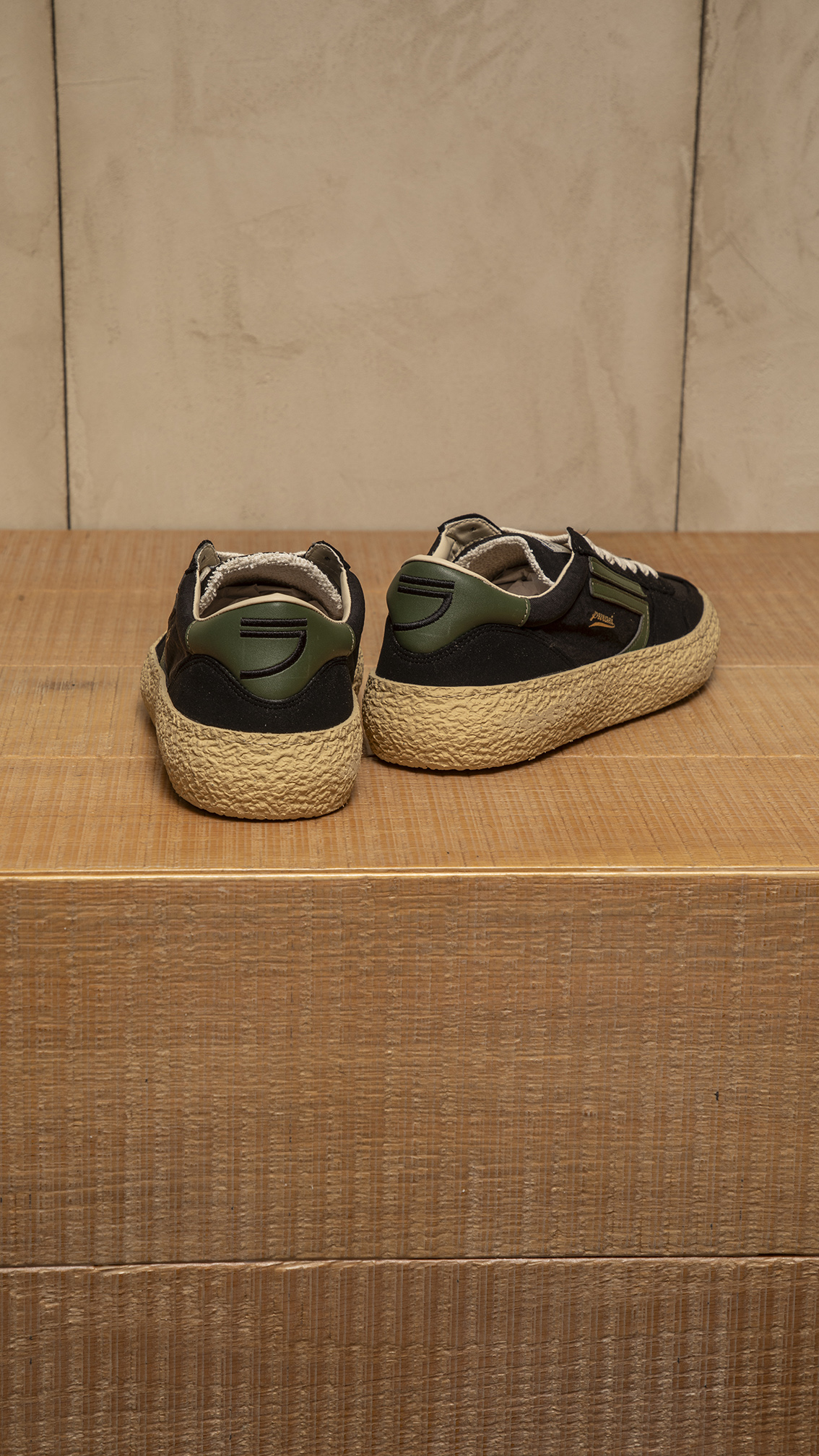 nylon nero e microsuede, con logo e dettagli verdi. Suola vaniglia e lacci bianchi .