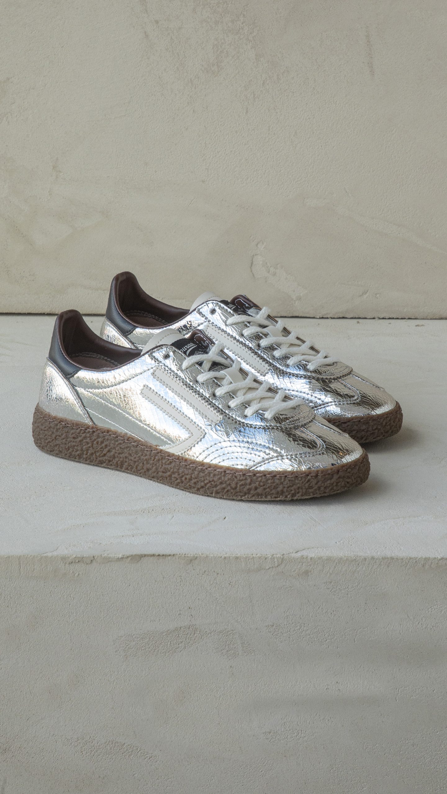 Variante in argento craquè con logo bianco e dettagli neri a contrasto, suola sterna cioccolato effetto vulcanizzato.