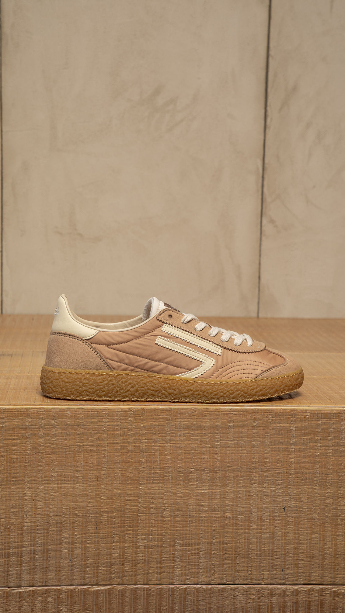 Tela e microsuede, logo e tallone a contrasto, soletta in sughero, suola vulcanizzata, pelle vegana.