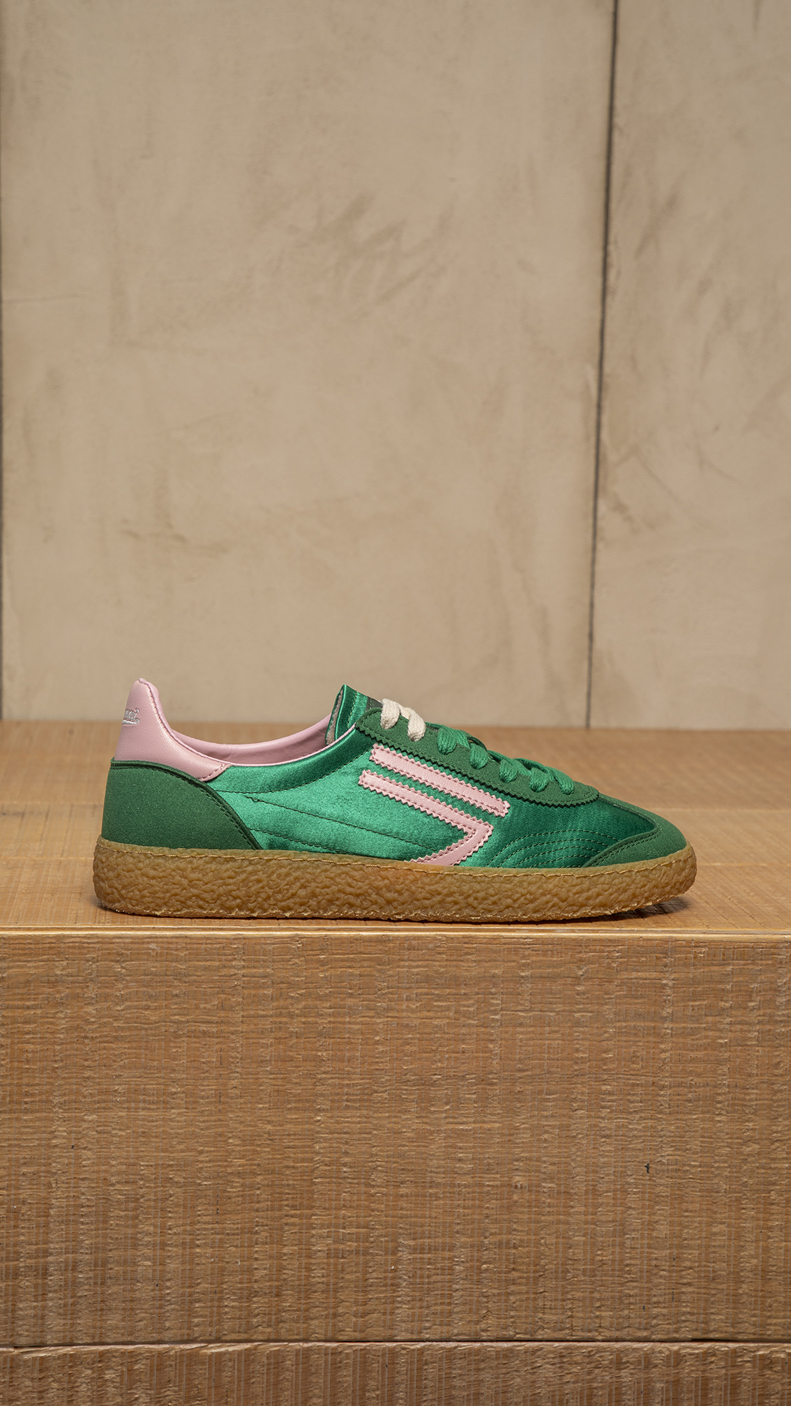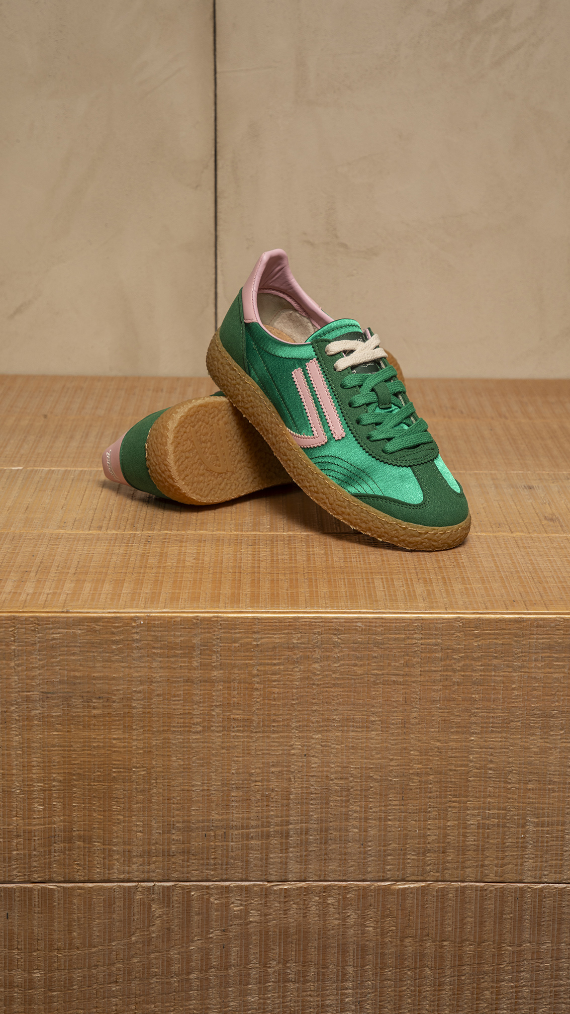 Raso e microsuede, logo e tallone a contrasto, suola color ambra effetto vulcanizzato, soletta interna in sughero. Doppio laccio: tono su tono o burro.