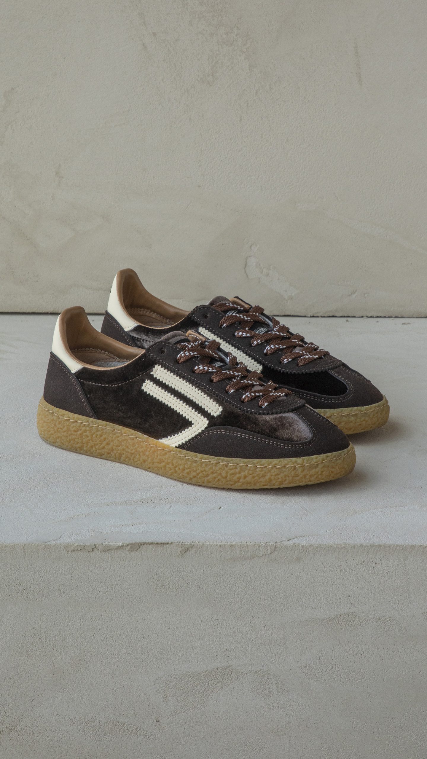 Variante sulle nuances dei marroni mixando suede e velluto a contrasto, logo bianco, fondo effetto vulcanizzato color miele.