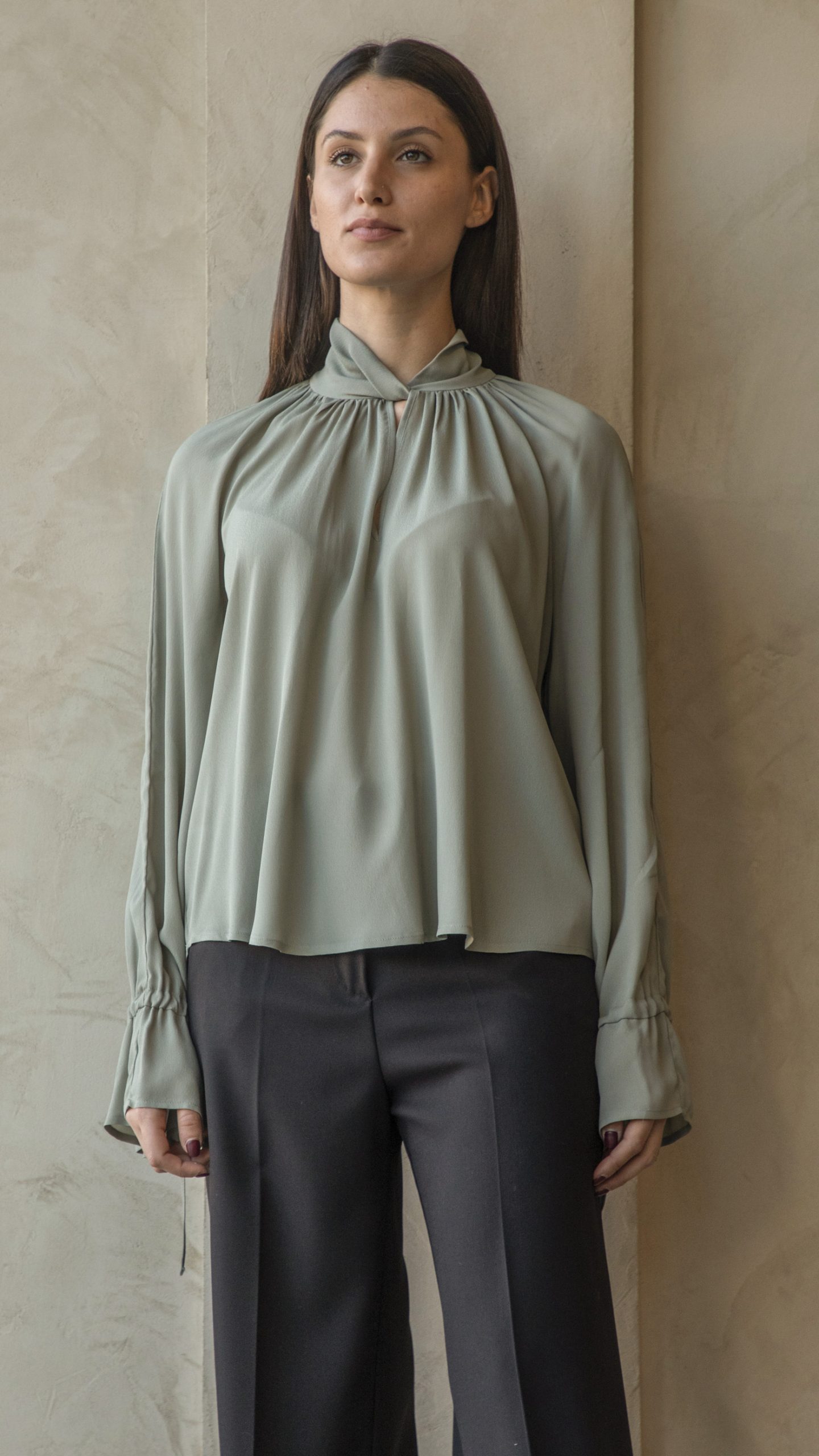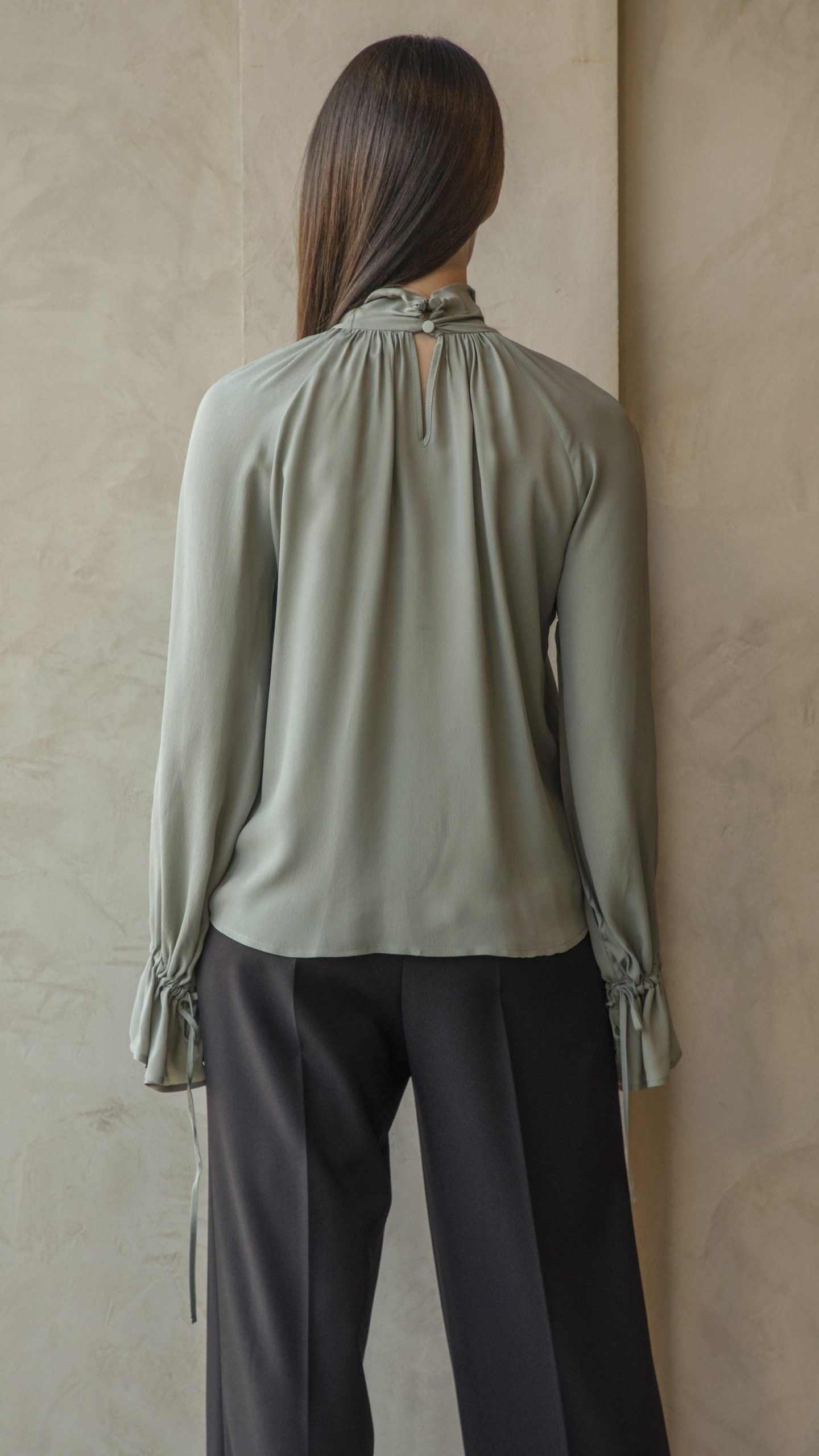 Blusa con collo alto, abbottonatura sul retro, manica con coulisse sul polso, vestibilità morbida