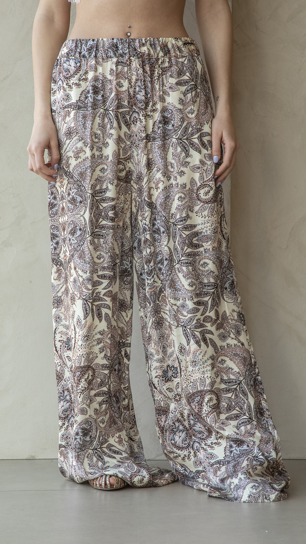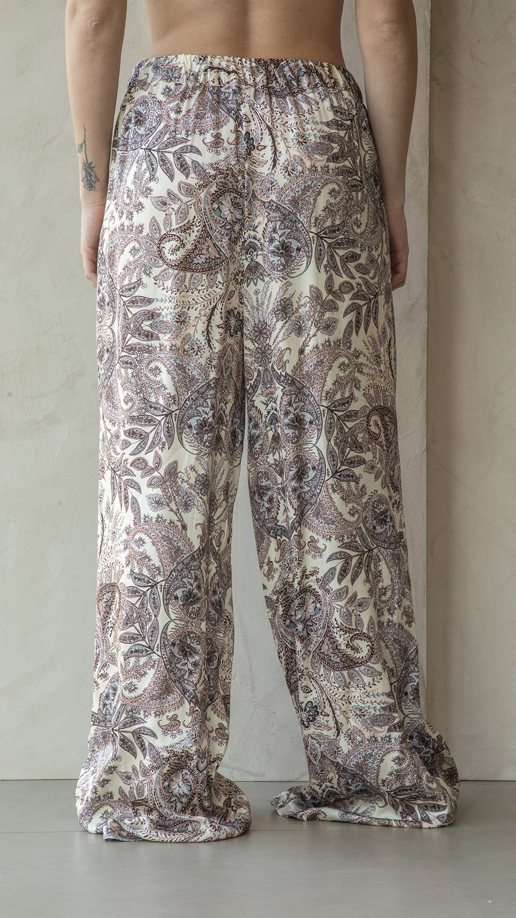 Pantalone taglio palazzo, con elastico in vita, tessuto fluido effetto raso, stampa in stile etro su base burro, tasche a scomparsa sul fianco.