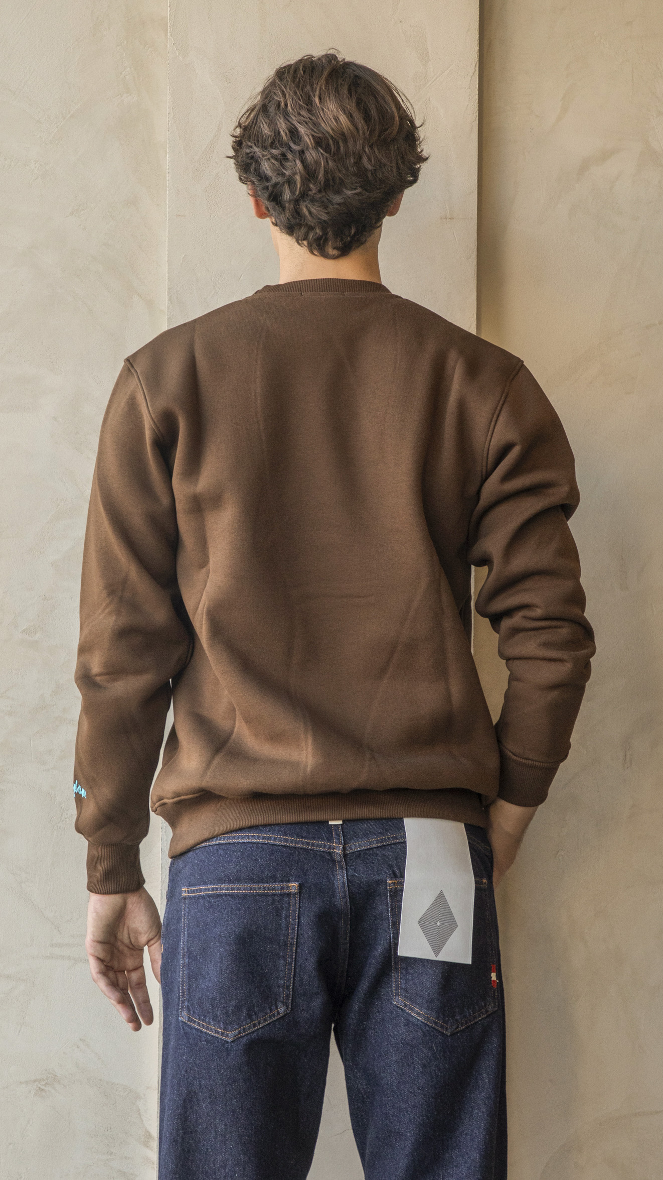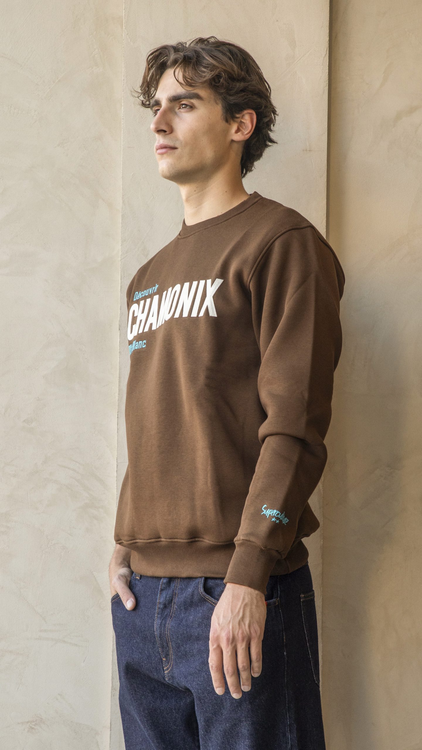 Felpa cioccolato, girocollo felpata, con scritta ricamata Chamonix