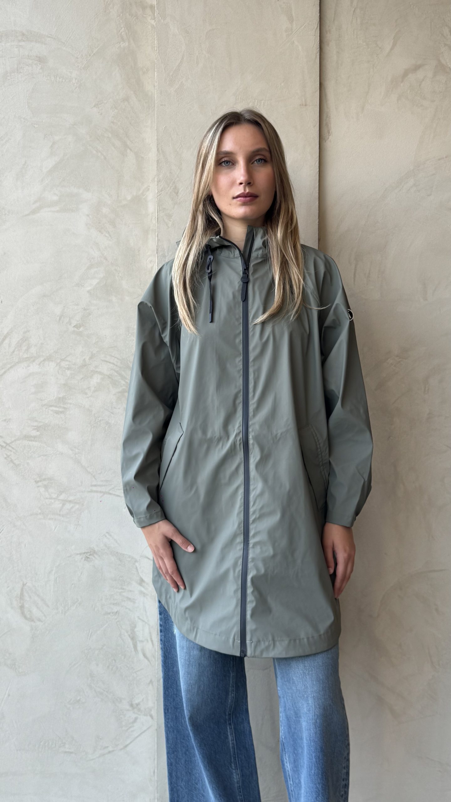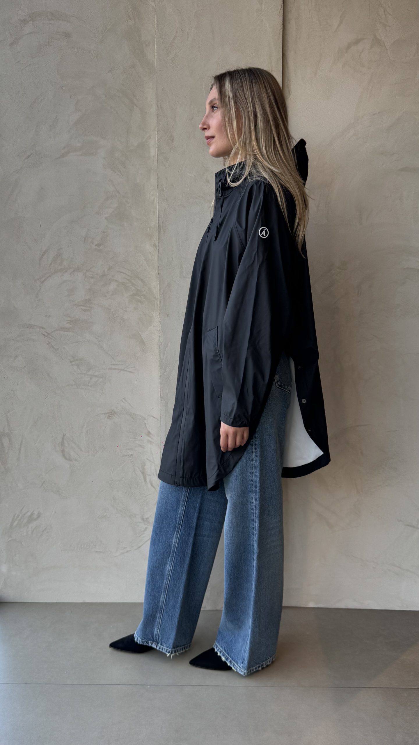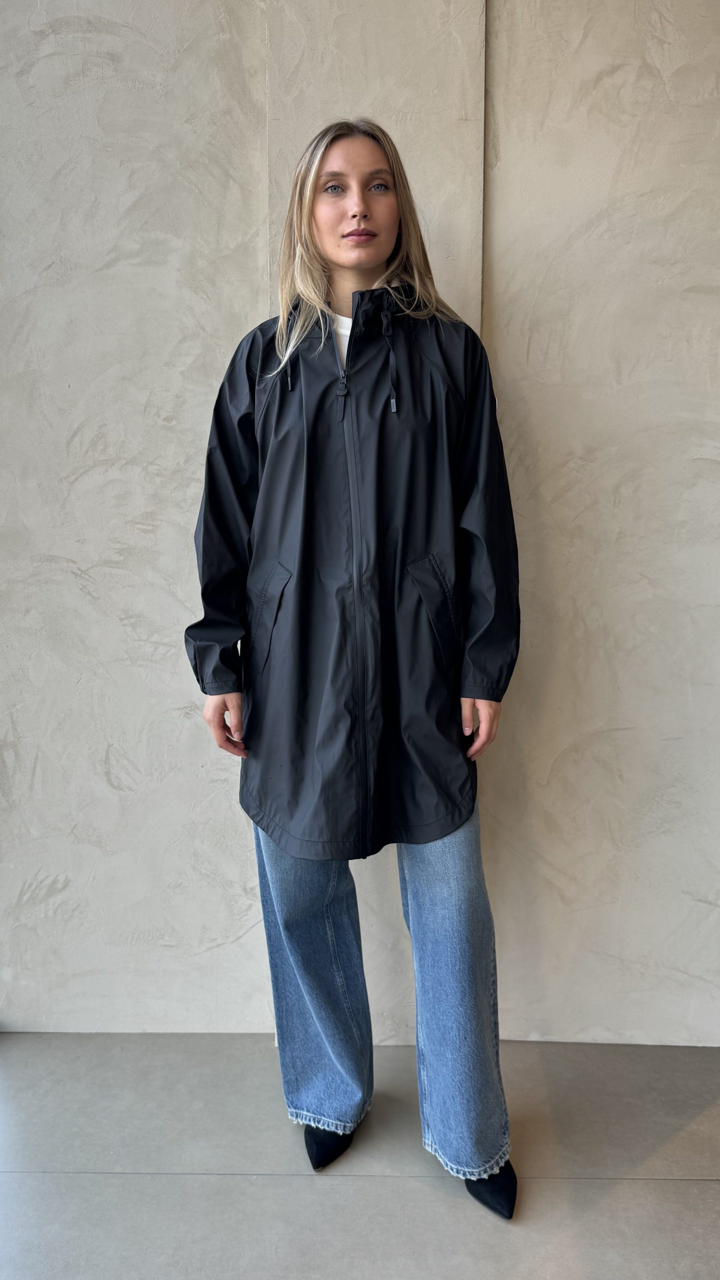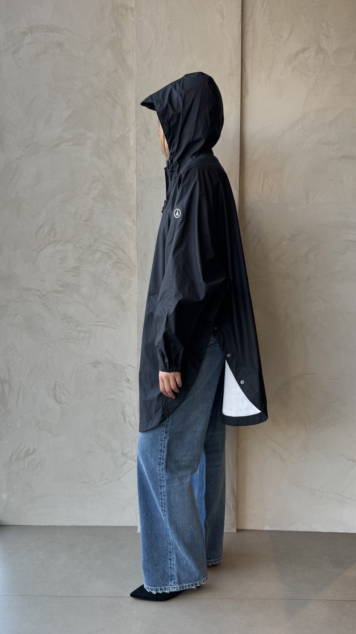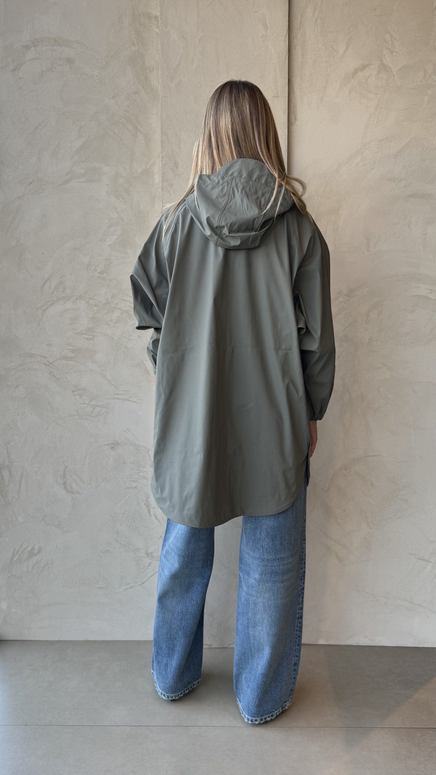 Mantella antipioggia con cuciture  e cerniera termosaldate è resistente alle intemperie. Realizzato con l’iconico tessuto in poliuretano amatissimo dal brande, presenta cuciture completamente sigillate per una protezione superiore (classificazione di impermeabilità 4000 mm). Vestibilità oversize e bottoni automatici lungo i lati per una maggiore fluidità e versatilità. Cursore singolo, cappuccio con culisse integrato.