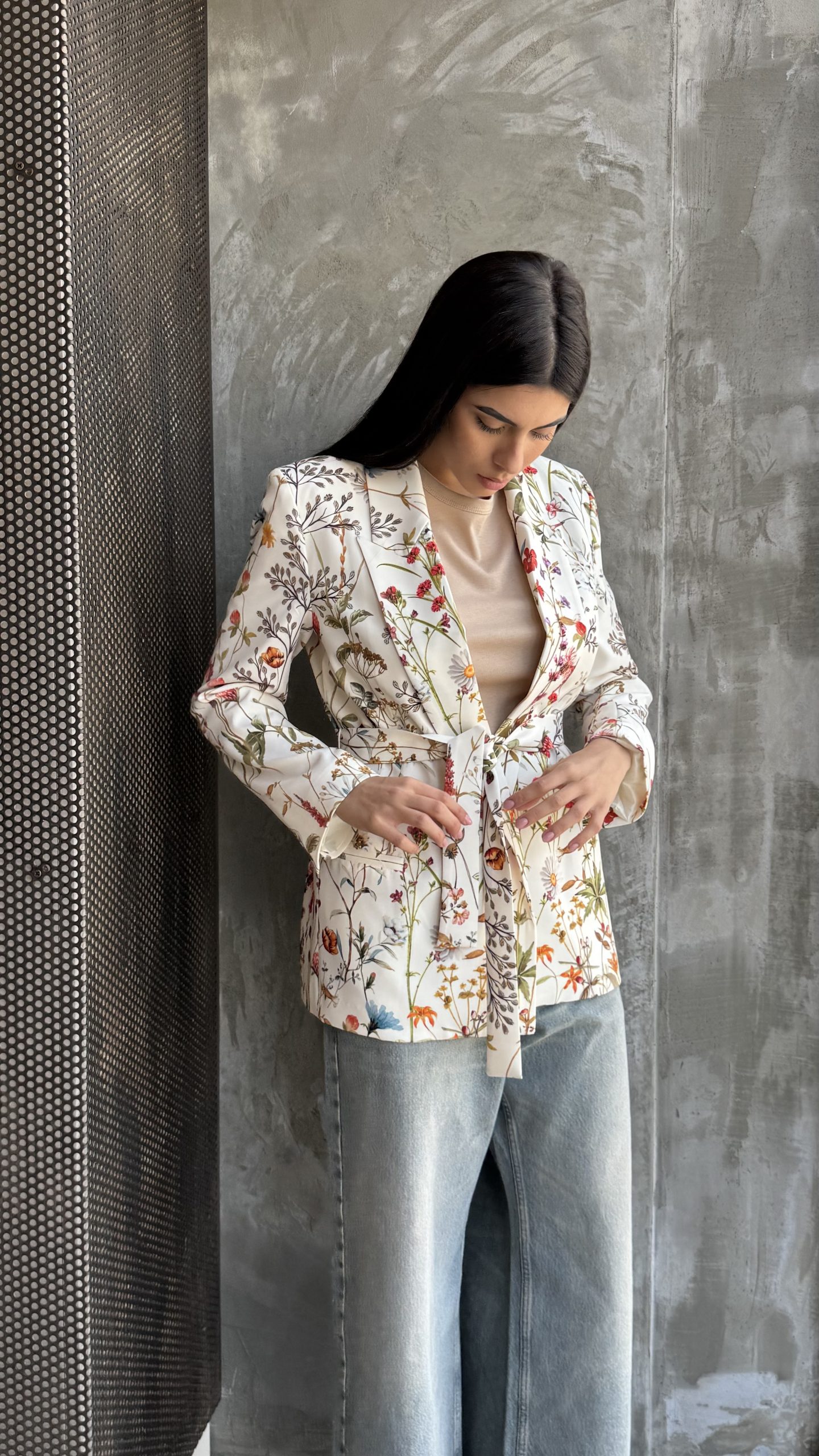 Giacca fantasia floreale, con fusciacca in vita, vestibilità regolare.