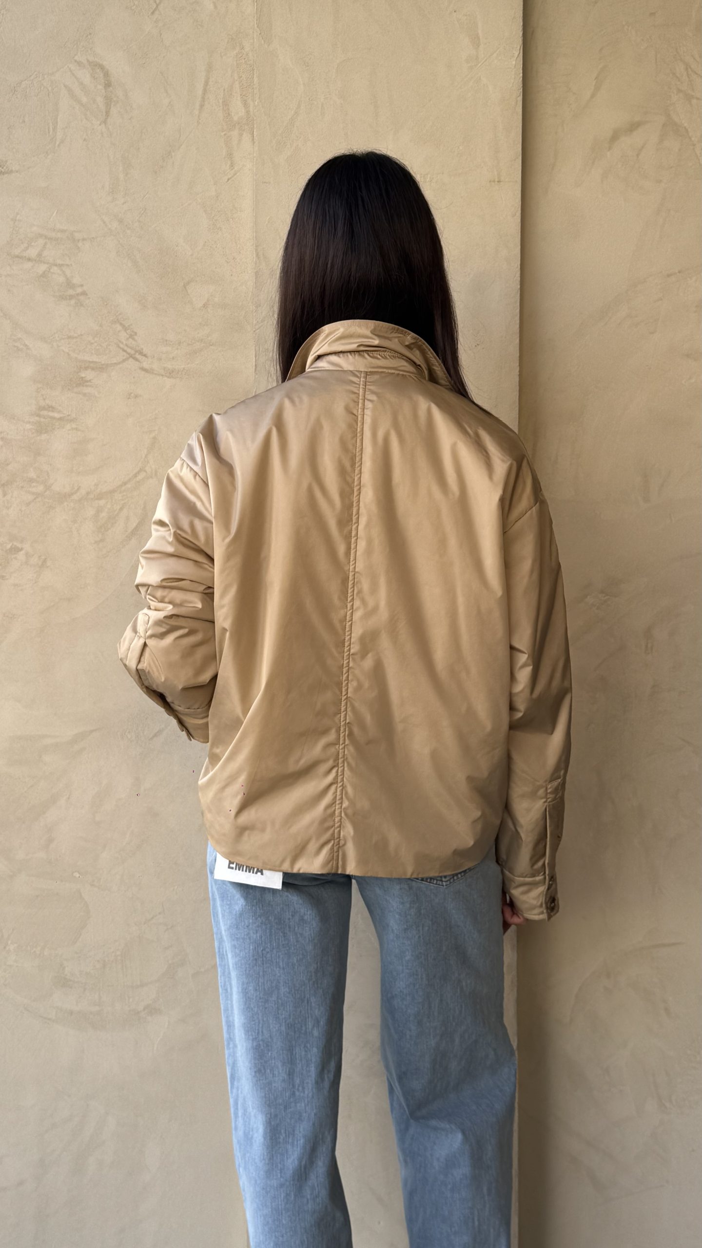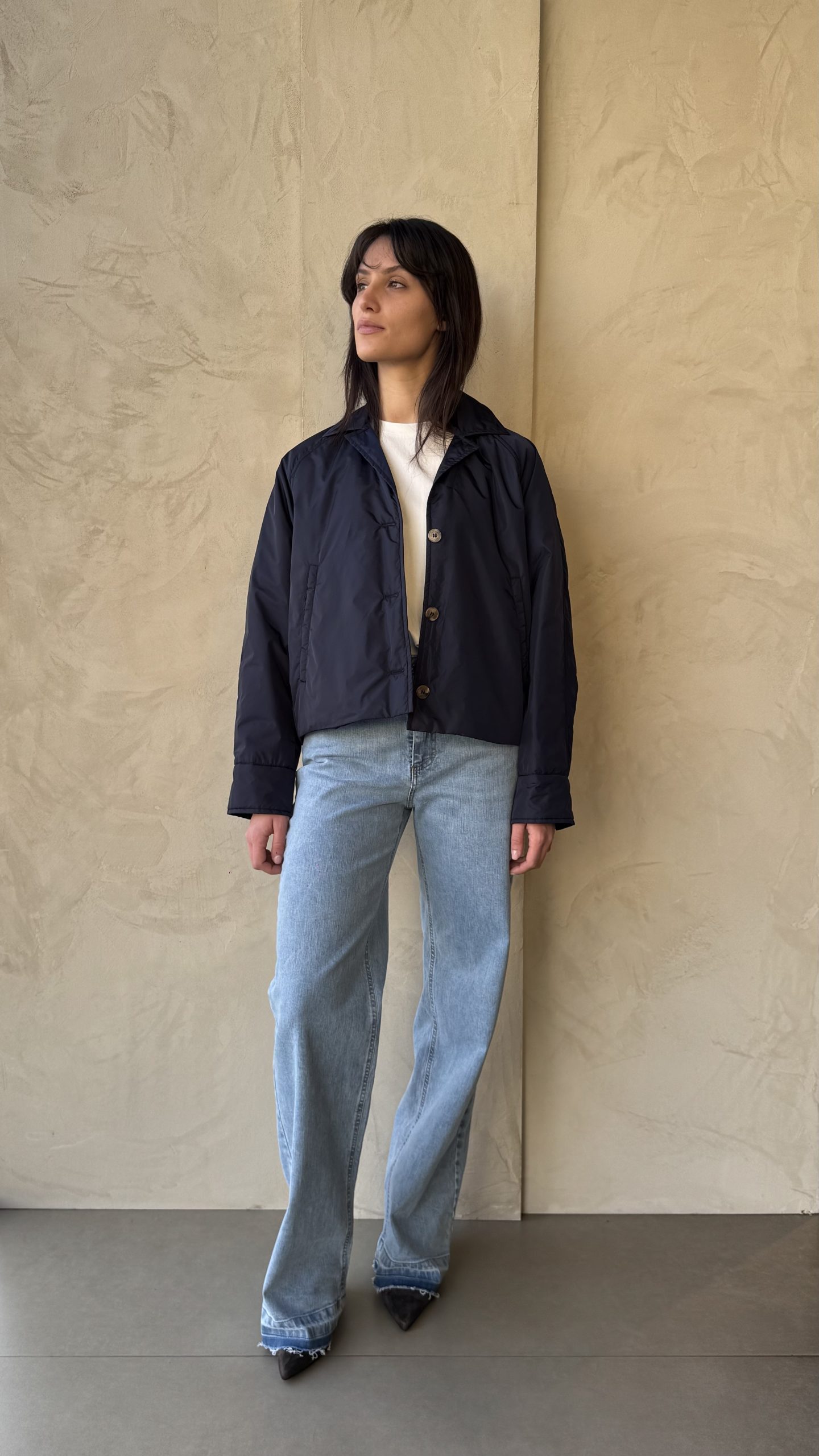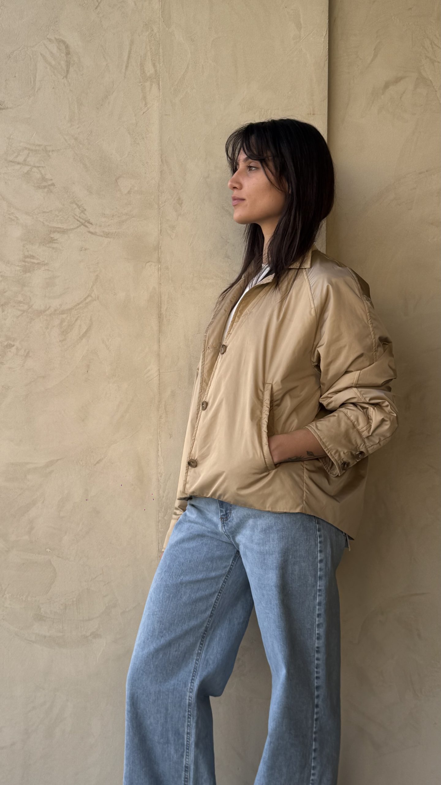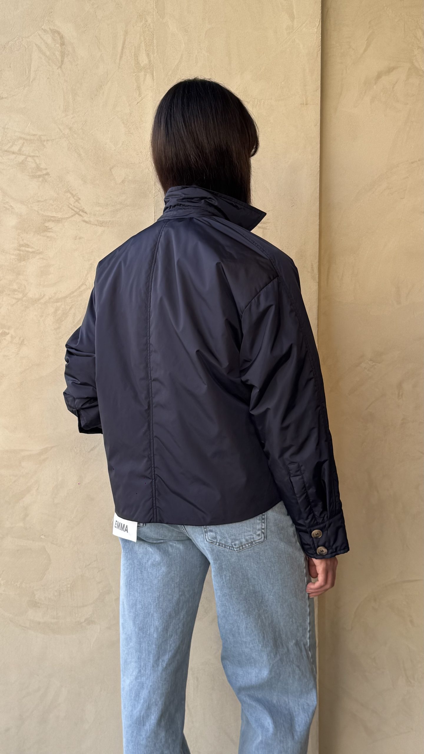 Giacca camicia imbottita, modello cropped liscio, con colletto e chiusura frontale con bottoni, tasche a filetto, fit morbido, dettaglio bottoni sui polsi.
