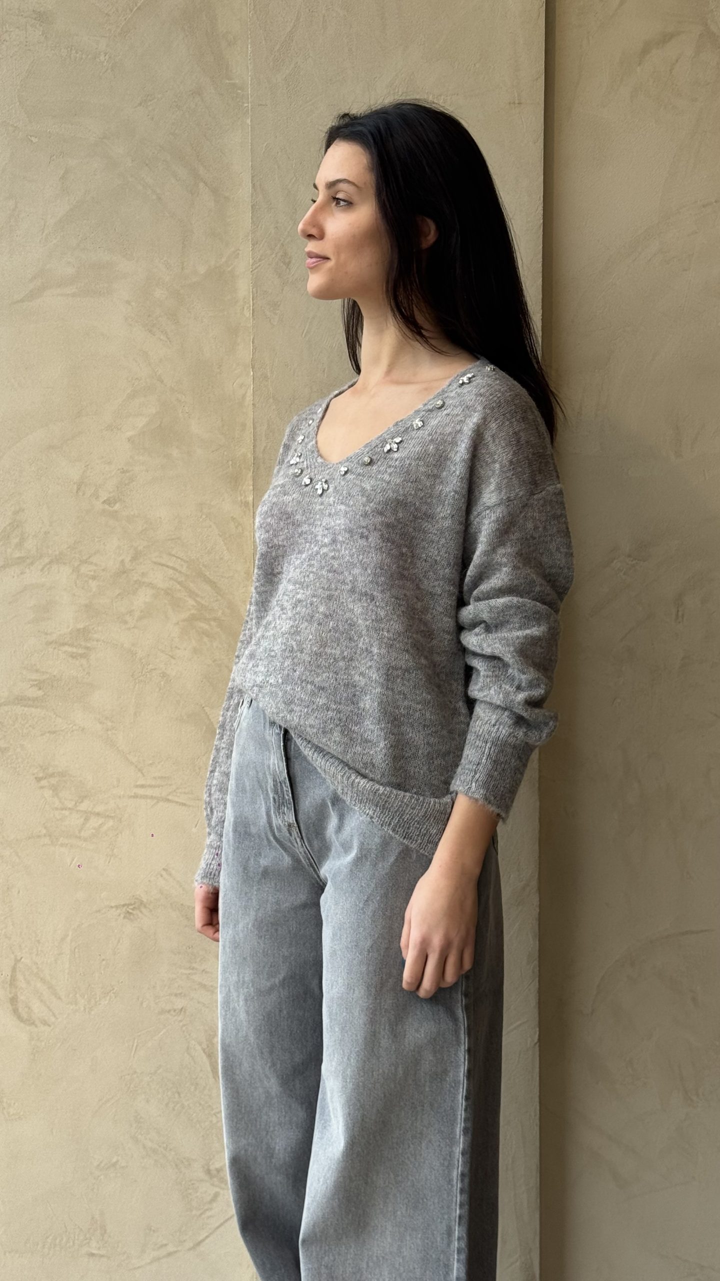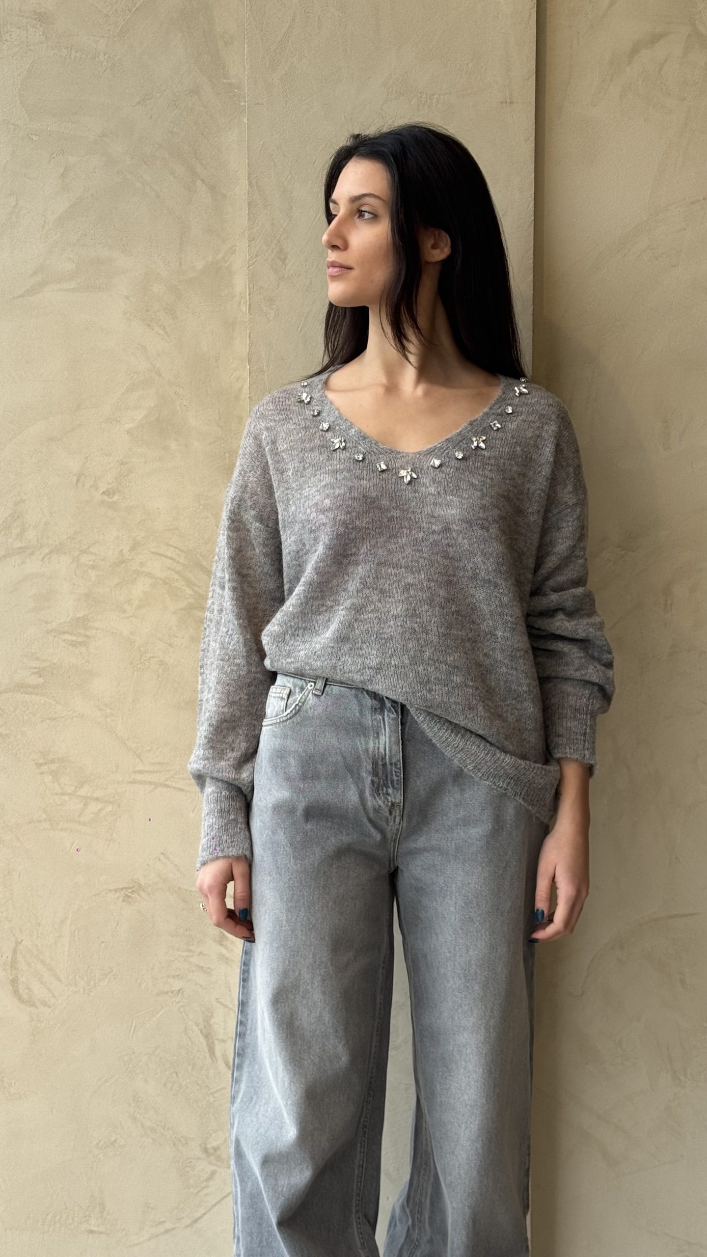 Maglia scollo a V con applicazioni e strass sul bordo, vestibilità morbida