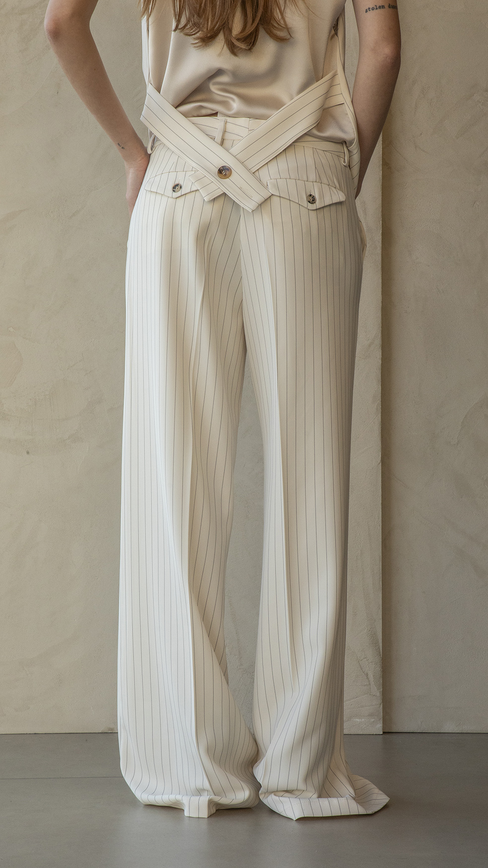 Pantalone ampio boy fit relax gessato. Chiusura con bottone e zip, passanti in vita. Tasche a pattina posteriori con chiusura con bottoni. Dettaglio piega al centro della gamba posteriore e anteriore.