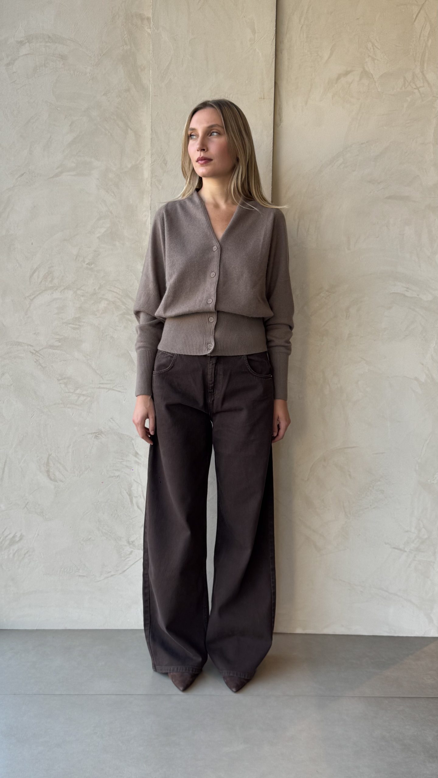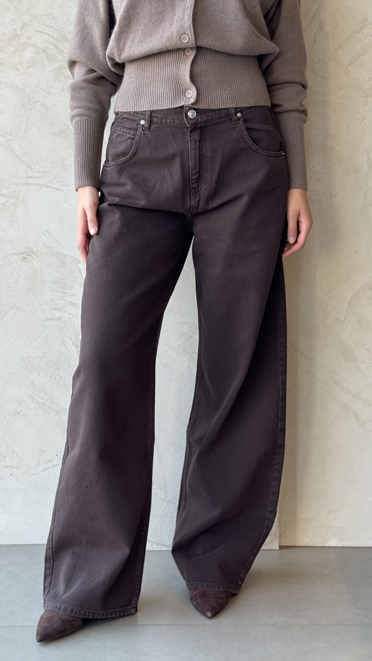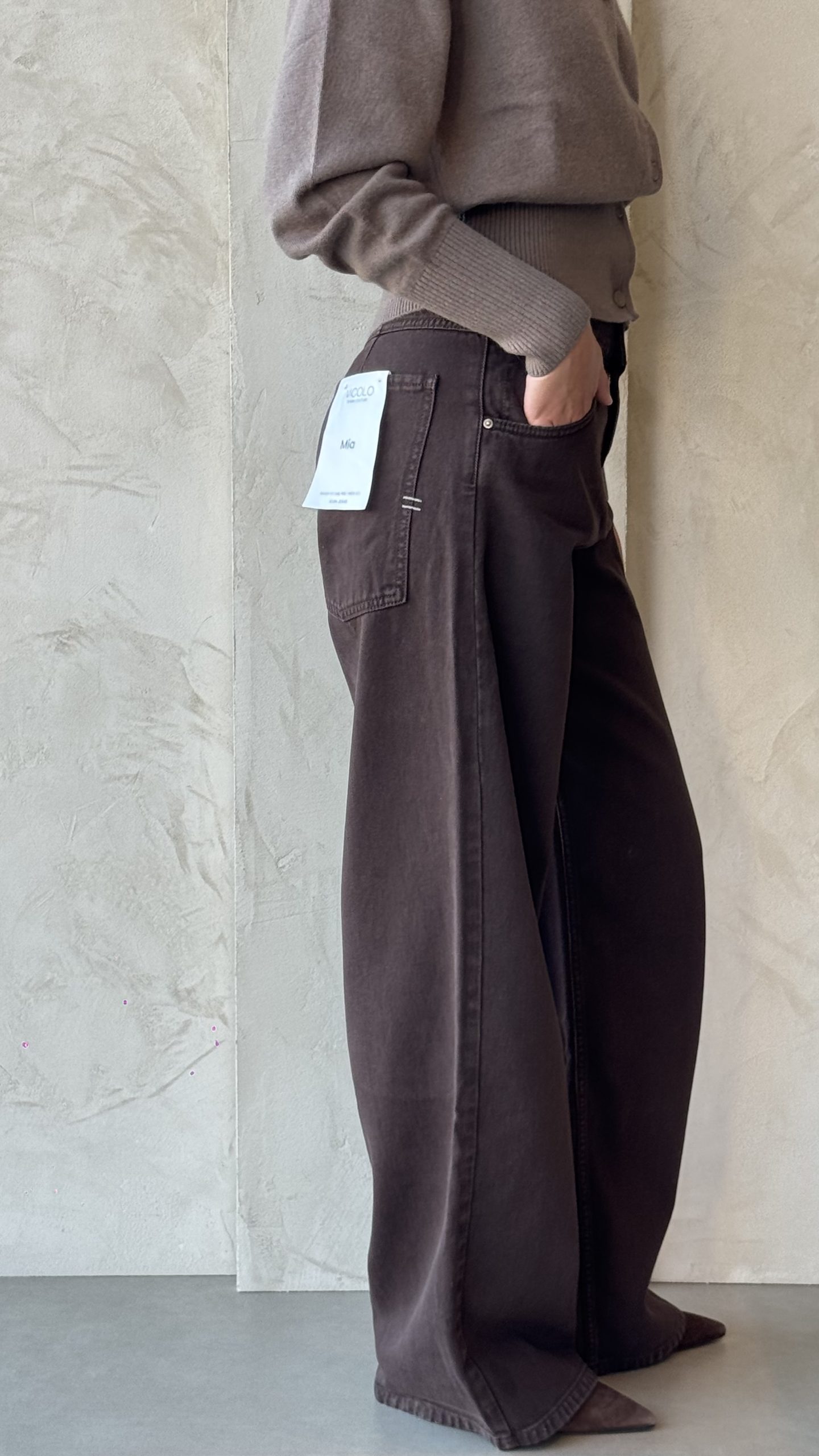 Pantaloni in denim bull cioccolato, baggy fit, mid rise,wide leg, cinque tasche, chiusura con bottone e zip